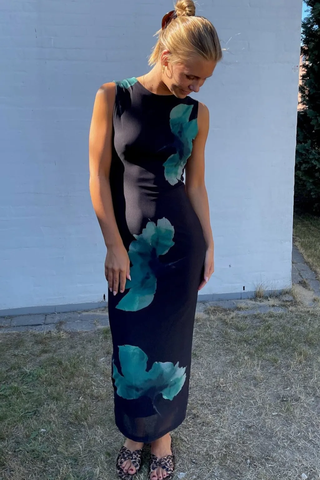 Lang kjole fra Sisters Point med store grønne blomster på mørk baggrund. Kjolen er ærmeløs og har en tætsiddende pasform.