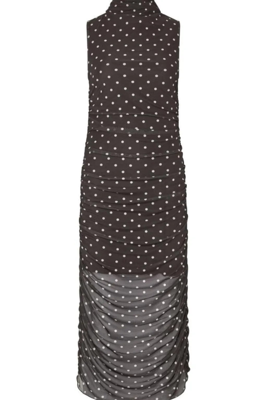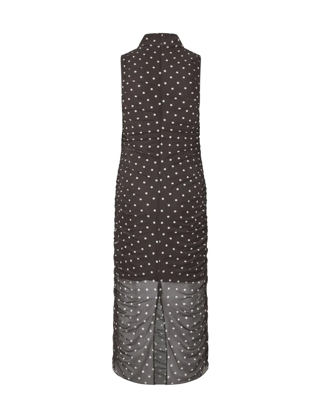En kjole fra MbyM med hvide prikker på brun baggrund. Kjolen har høj hals og er uden ærmer.