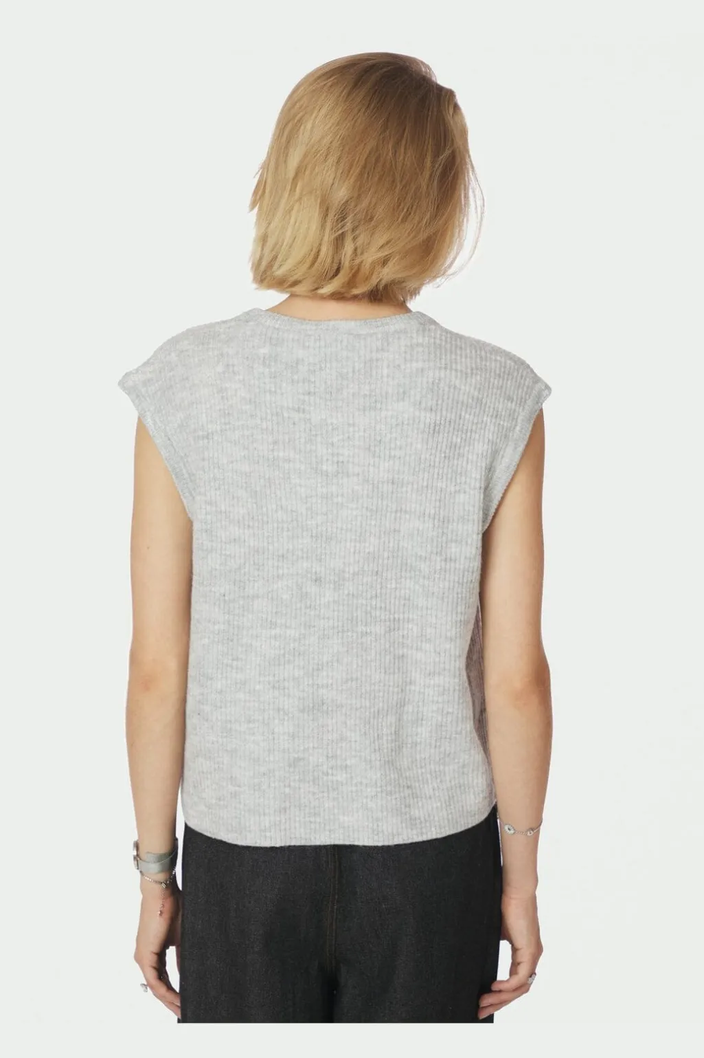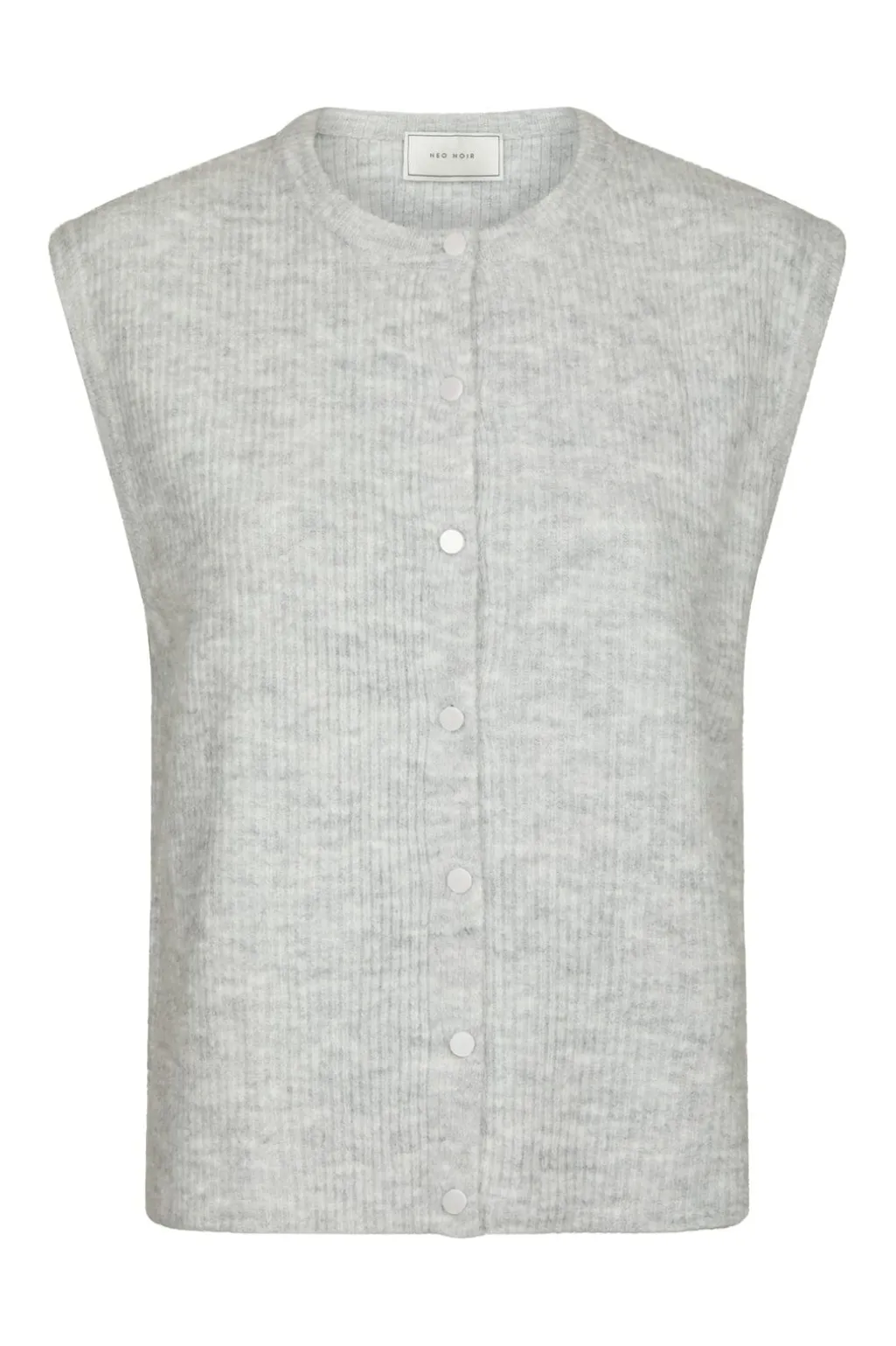 Strikket vest fra Neo Noir i lys grå melange. Vesten har en ribbet tekstur og knaplukning foran. Den løse pasform giver god bevægelsesfrihed.