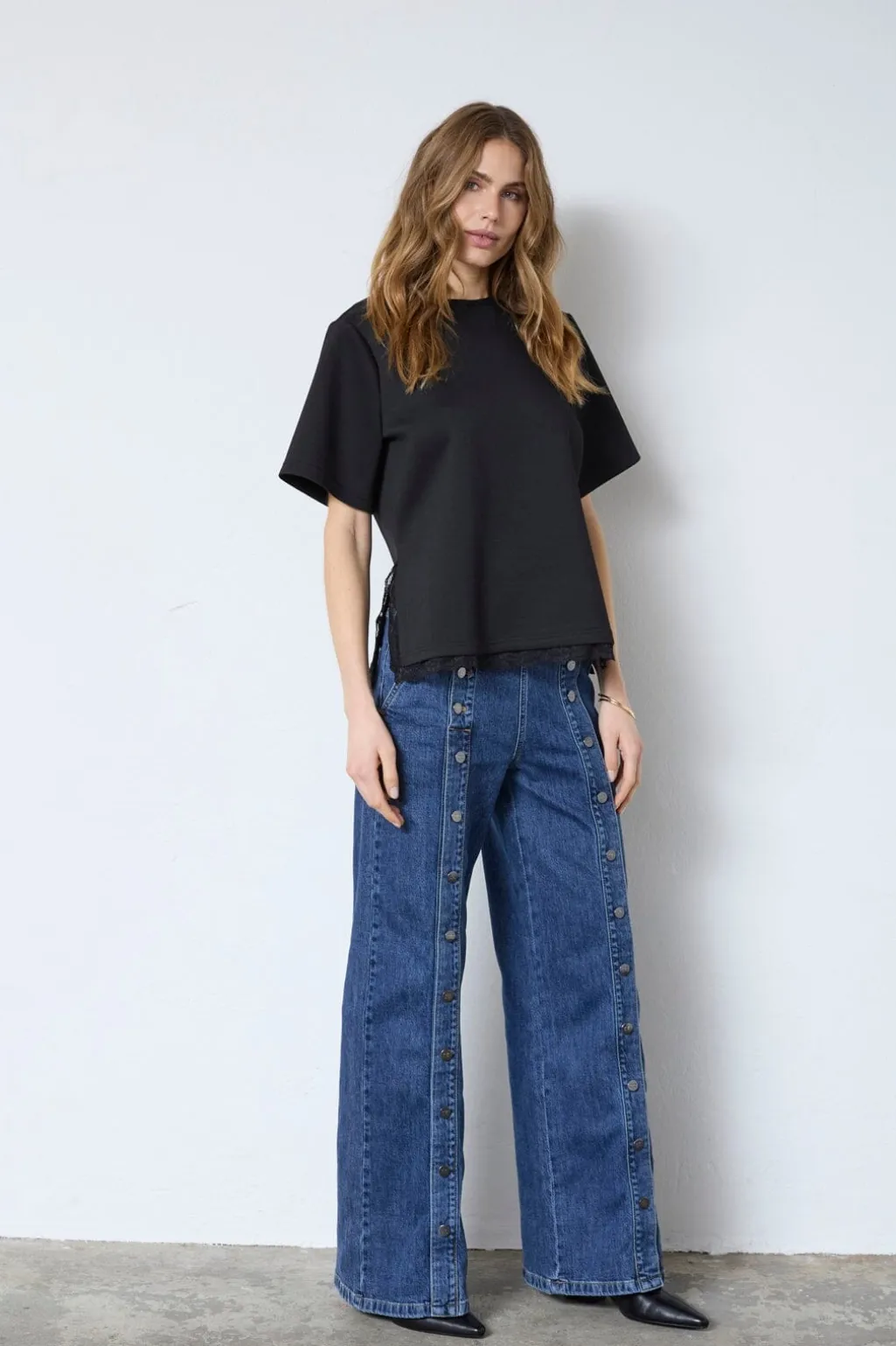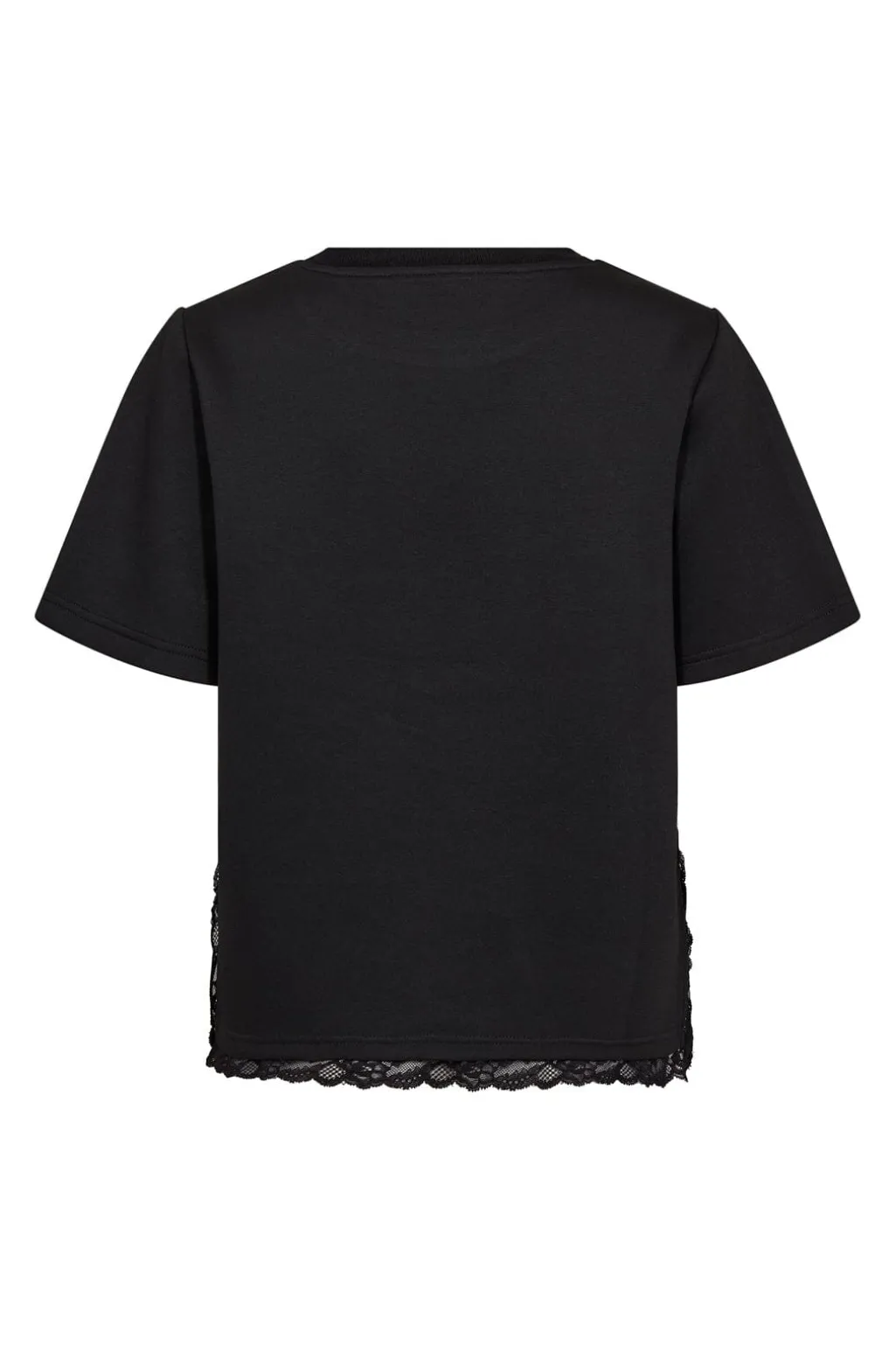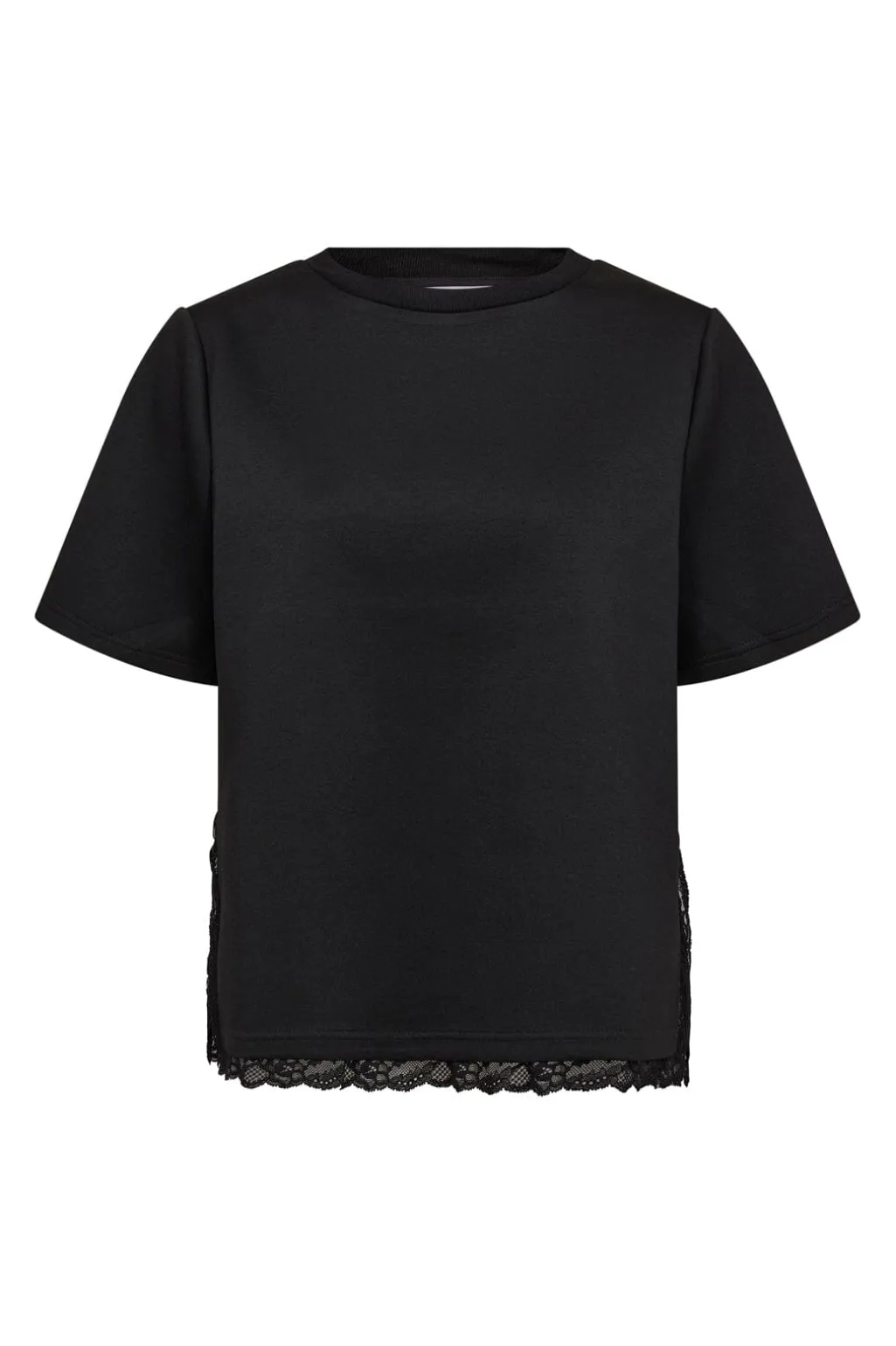 Sort T-shirt fra Co´Couture med blonder langs bunden. T-shirten har korte ærmer, rund hals og et løst snit i sort.