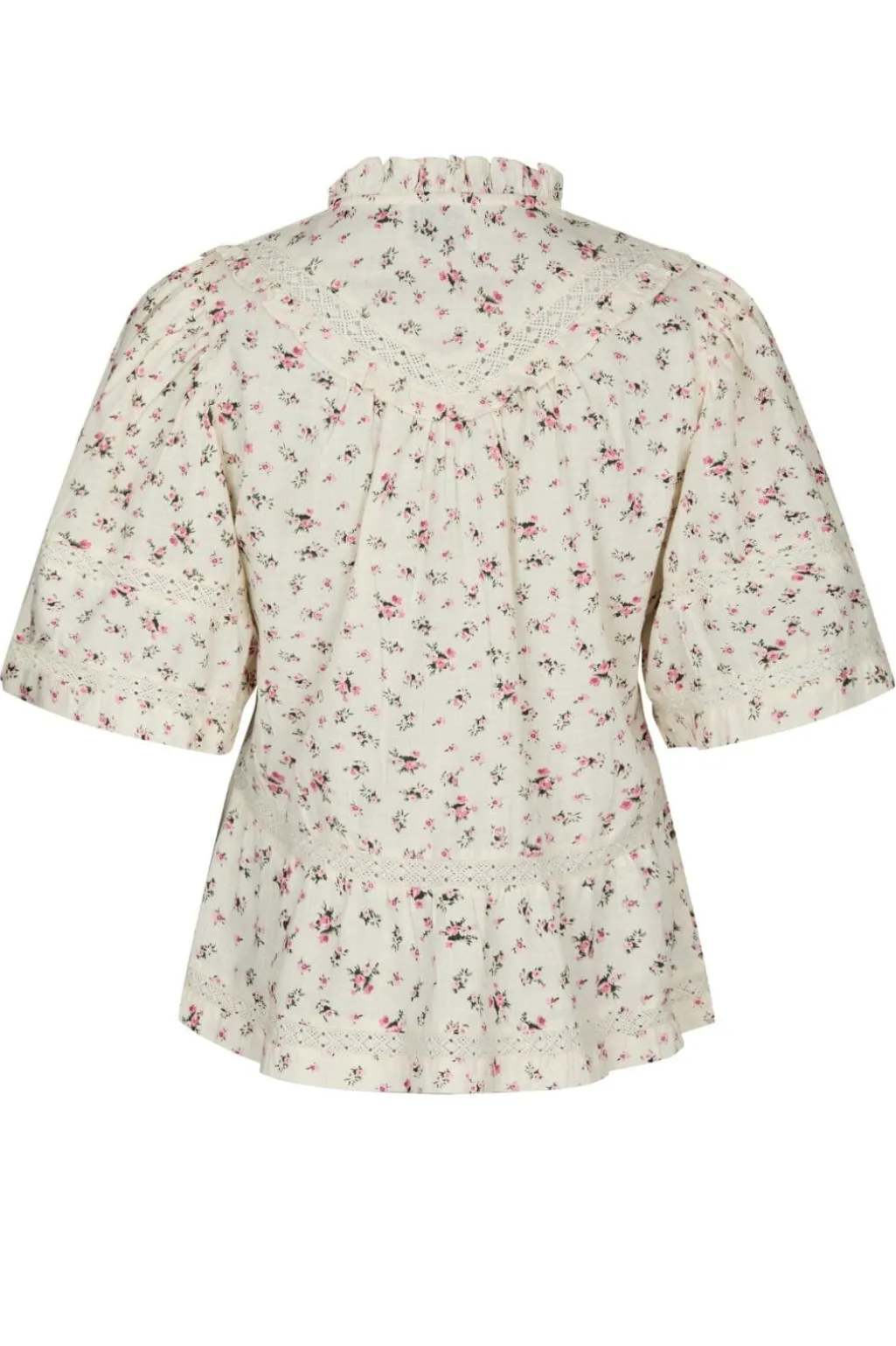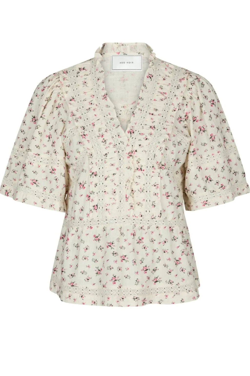 Blomstret top fra Neo Noir i hvid med lyserøde blomster. Toppen har korte puffede ærmer og en v-hals med blondedetaljer. Designet kombinerer et let bomuldsstof med feminine detaljer.