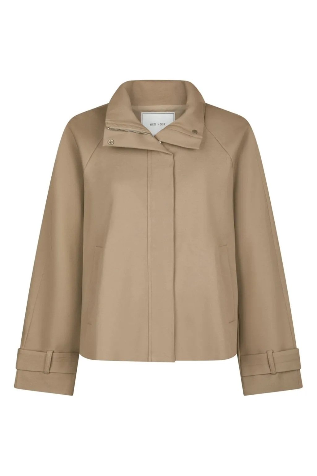 Sandfarvet jakke fra Neo Noir med høj krave og skjult lynlås. Den enkle jakke har praktiske lommer og justerbare stropper på ærmerne.