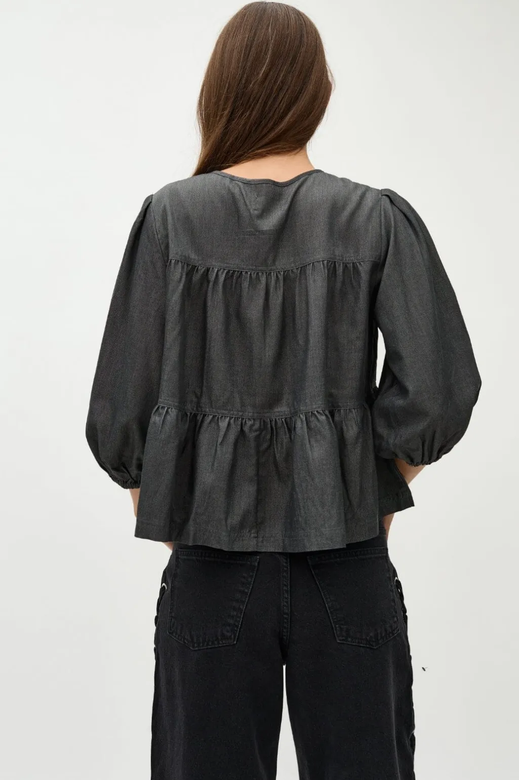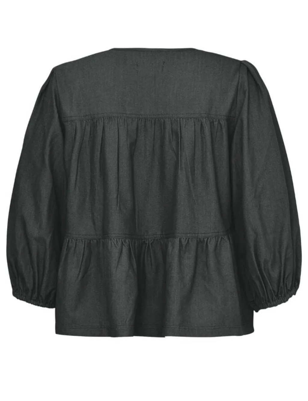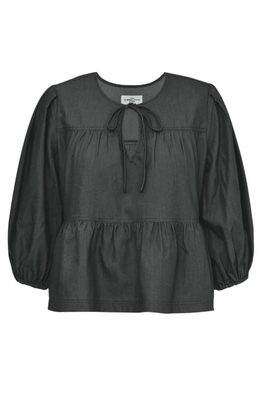 Sort bluse fra Global Funk med lagdelt design og flæser. V-hals med snøredetaljer og 3/4 pufærmer med elastiske manchetter giver blusen et feminint præg.