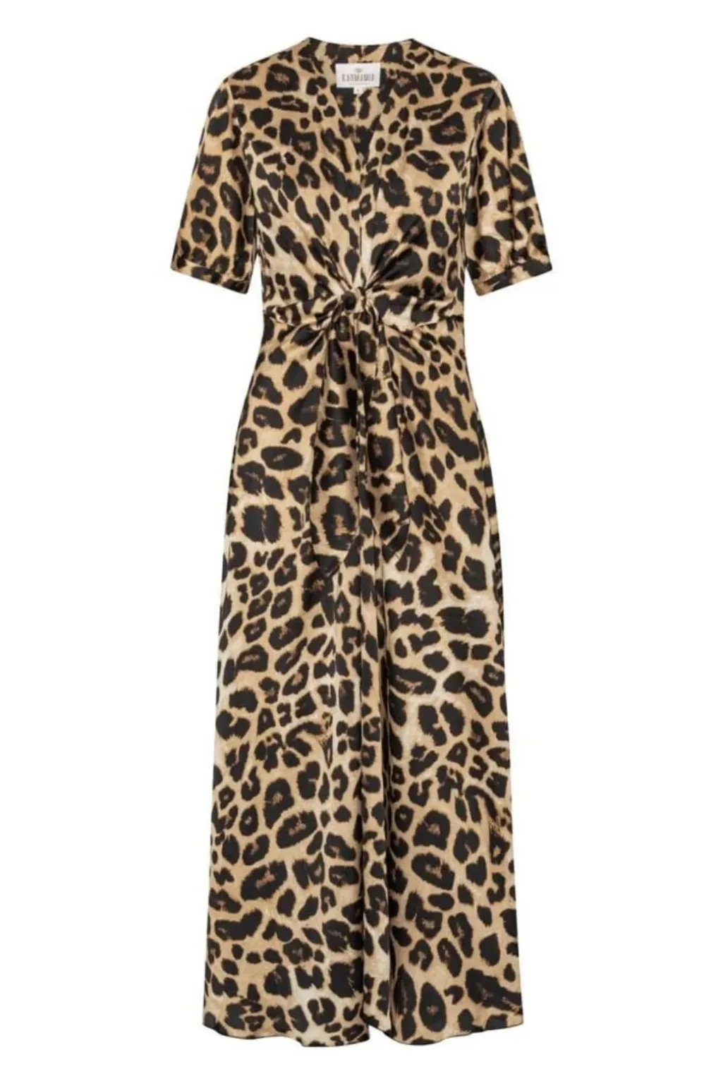Kjole fra Karmamia i brun og beige leopardprint. Den har V-hals, korte ærmer og et bindebånd i taljen. Stoffet er lavet af genanvendt og almindelig polyester.