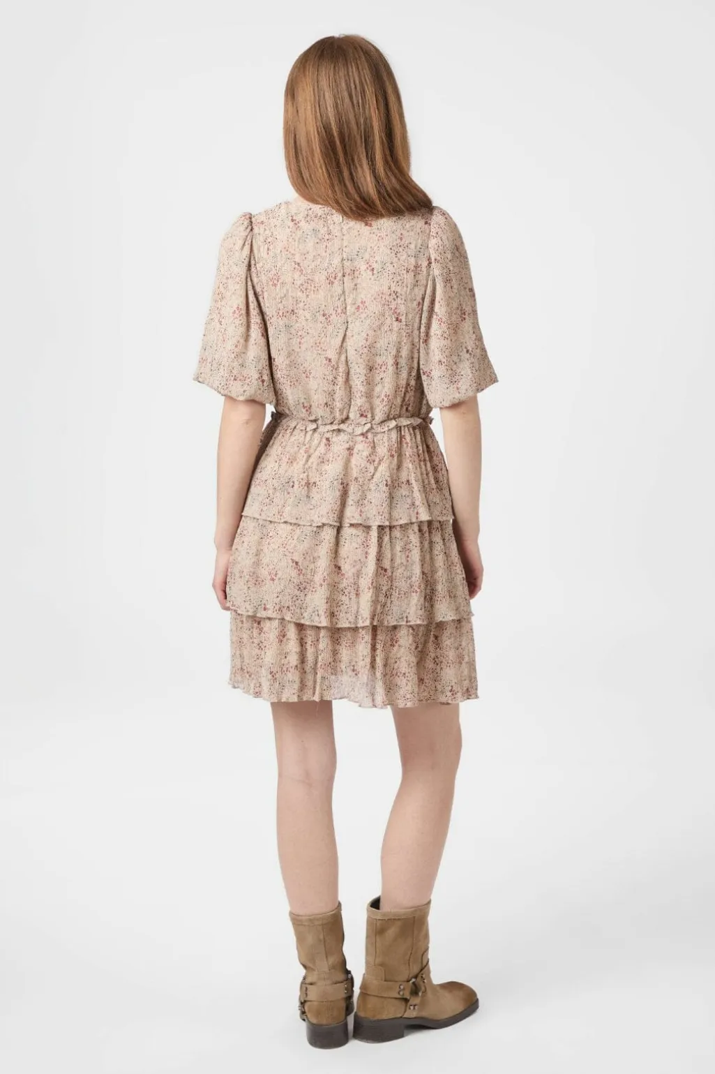 Sommerkjole fra Neo Noir i sand med blomsterprint. Kjolen har tre lag flæser i underdelen, puffede ærmer og en elastisk talje med bindebånd.