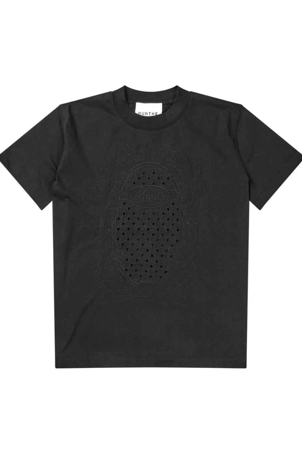 Sort t-shirt med hulmønster og broderi fra Munthe. T-shirten har en rund halsudskæring og korte ærmer.