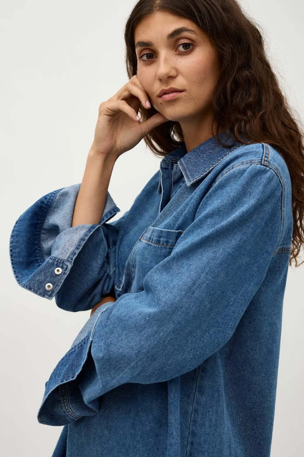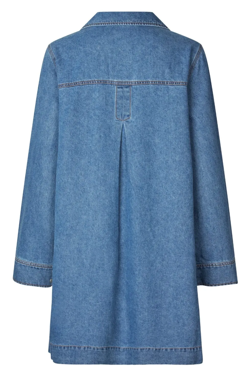Denimkjole i mid vintage blue med polokrave og lange ærmer. Kjolen har en regular fit og går til midt på låret. De dekorative syninger giver et håndværksmæssigt præg.