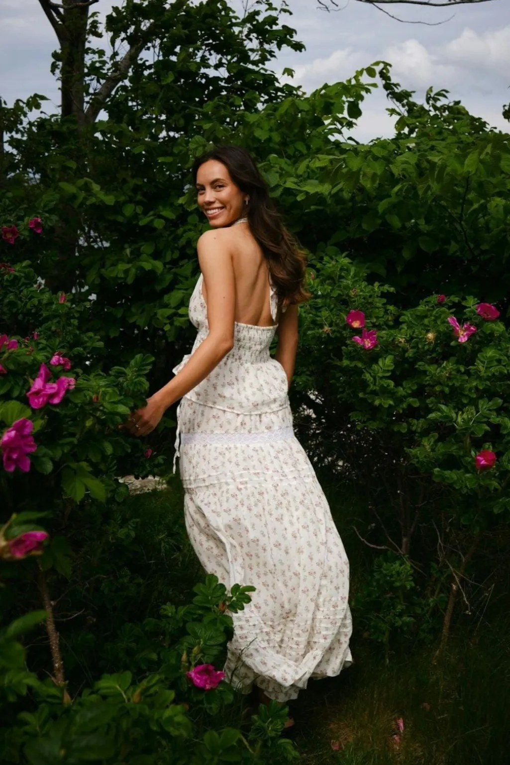 Lang nederdel fra Neo Noir i creme med små lyserøde blomster. Nederdelen har flæser og læg, der skaber bevægelse i stoffet, samt en elastisk talje med bindebånd.