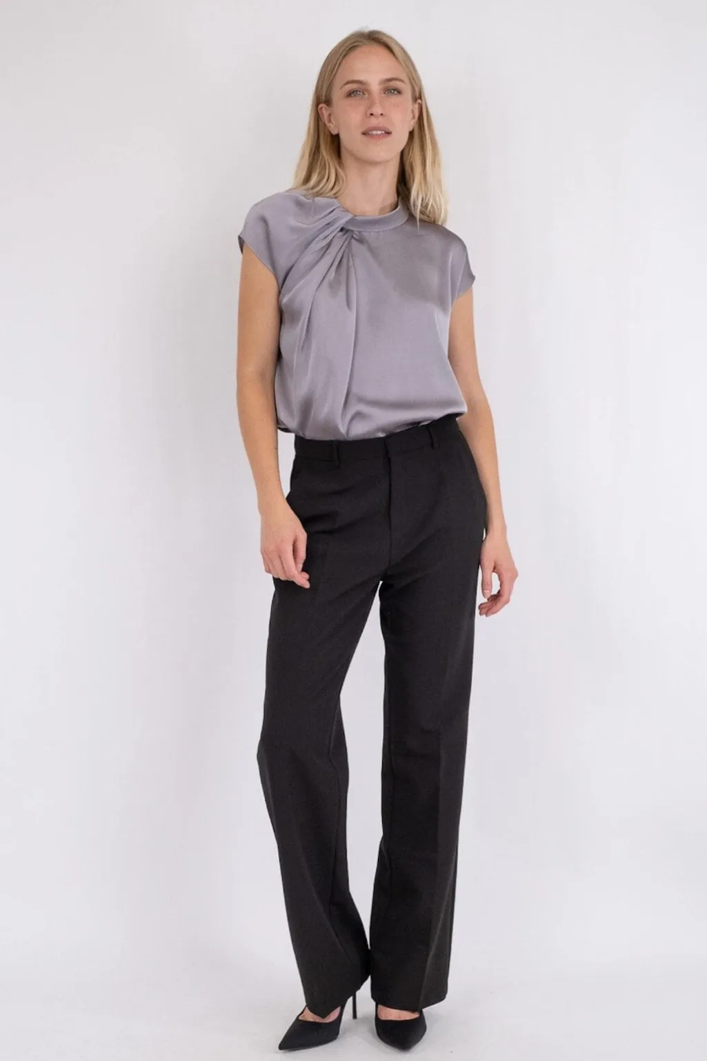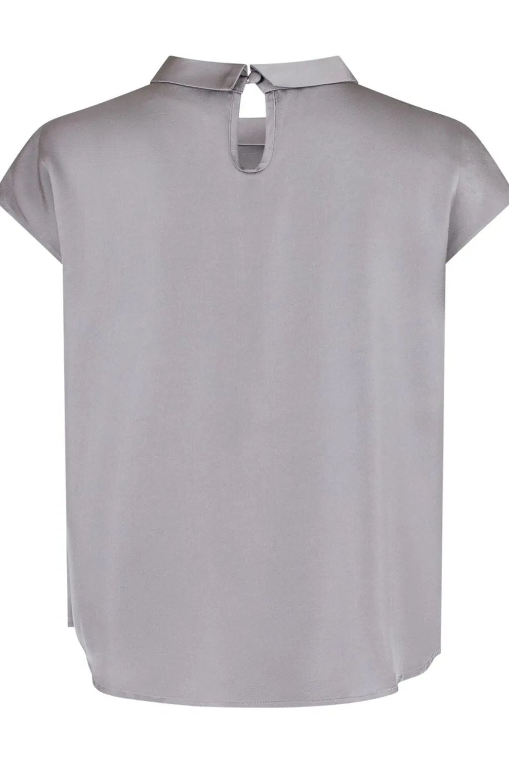 Grå satinbluse fra Neo Noir med høj hals og knudedetalje. Blusen har en løs pasform og korte ærmer, der giver god bevægelsesfrihed.