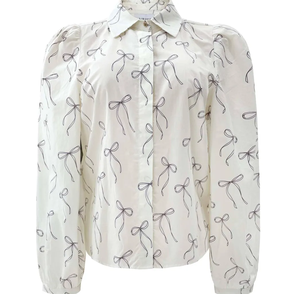 Cremefarvet bluse fra Liberte med et mønster af sorte sløjfer. Blusen har lange ærmer og en klassisk skjortekrave.