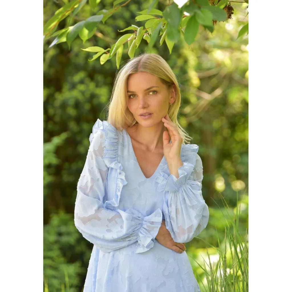 Maxi-kjole fra A-View i lyseblå med blomsterprint. Kjolen har lange ærmer og når ned til anklerne. Den er syet i 100 % polyester og passer til bryllupper og formelle arrangementer.
