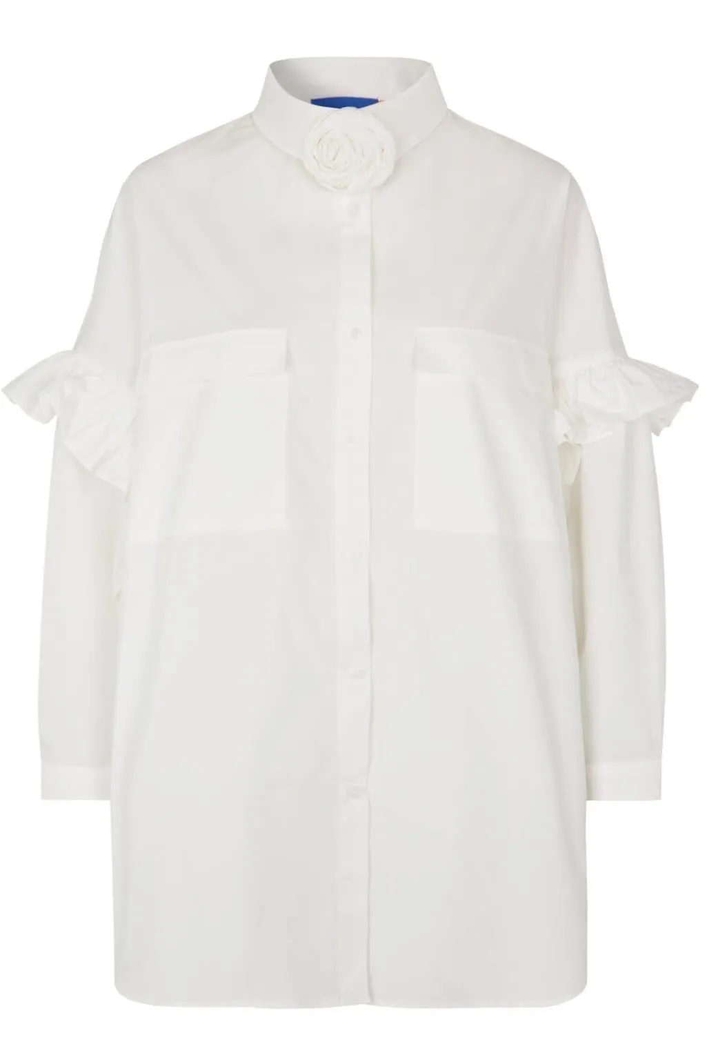 Hvid skjorte fra Cras i økologisk bomuld med oversized pasform. Skjorten har to store brystlommer, skjortekrave og en aftagelig blomsterklips ved kraven.