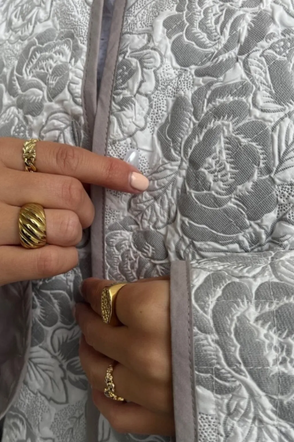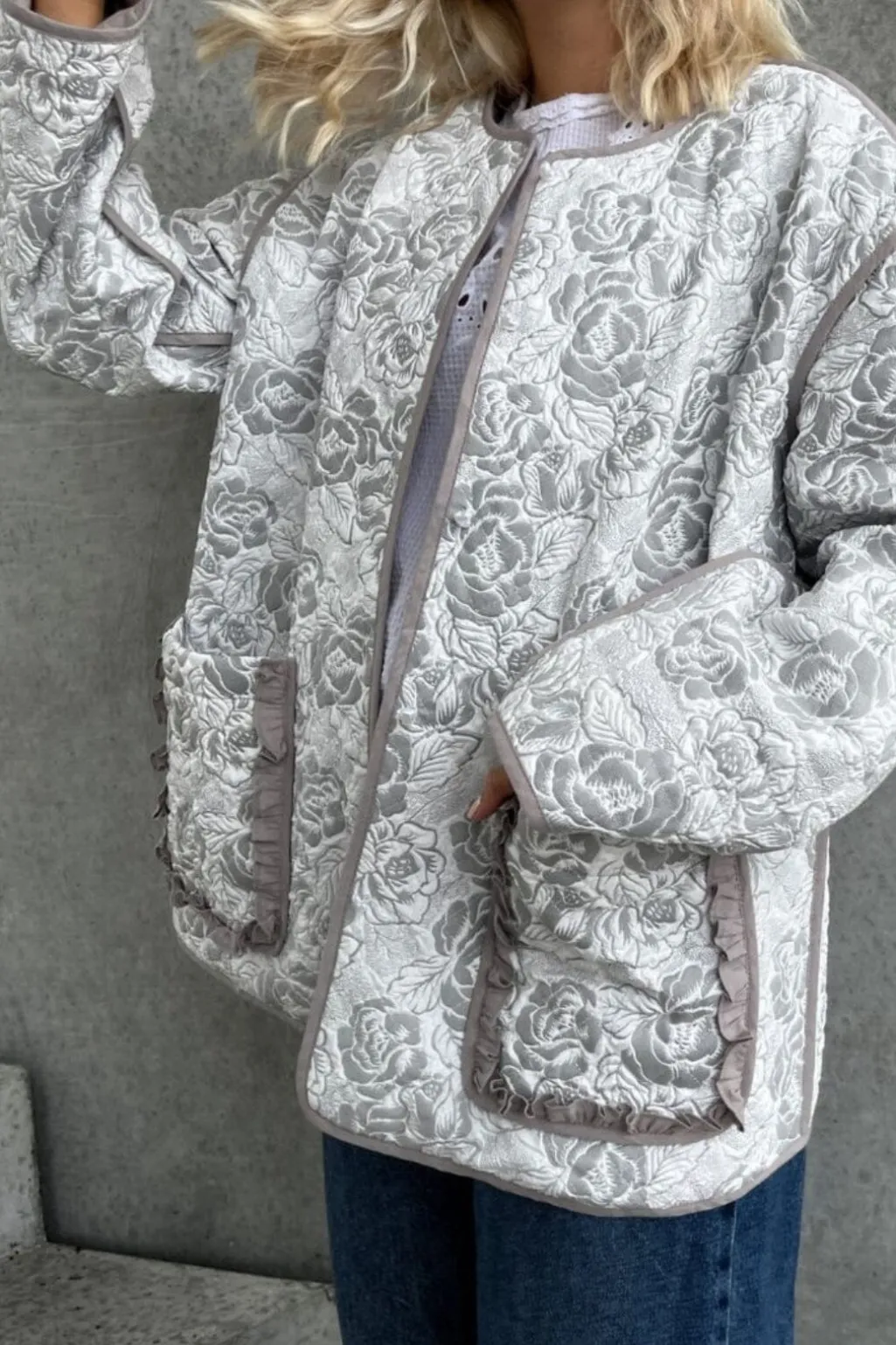 Grå jakke fra Stories From The Atelier by Copenhagen Shoes med kviltet blomstermønster. Jakken har flæsedetaljer langs lommer og kanter samt en rund halsudskæring.