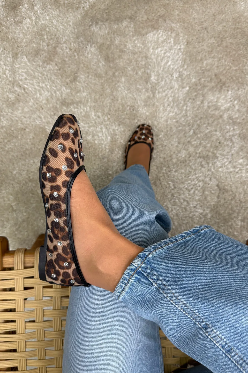 Ballerinaer fra Bloom med leopardmønster i brun og beige. Skoene har små rhinsten på overdelen og en firkantet tå. Det syntetiske materiale giver skoene et blankt udtryk.