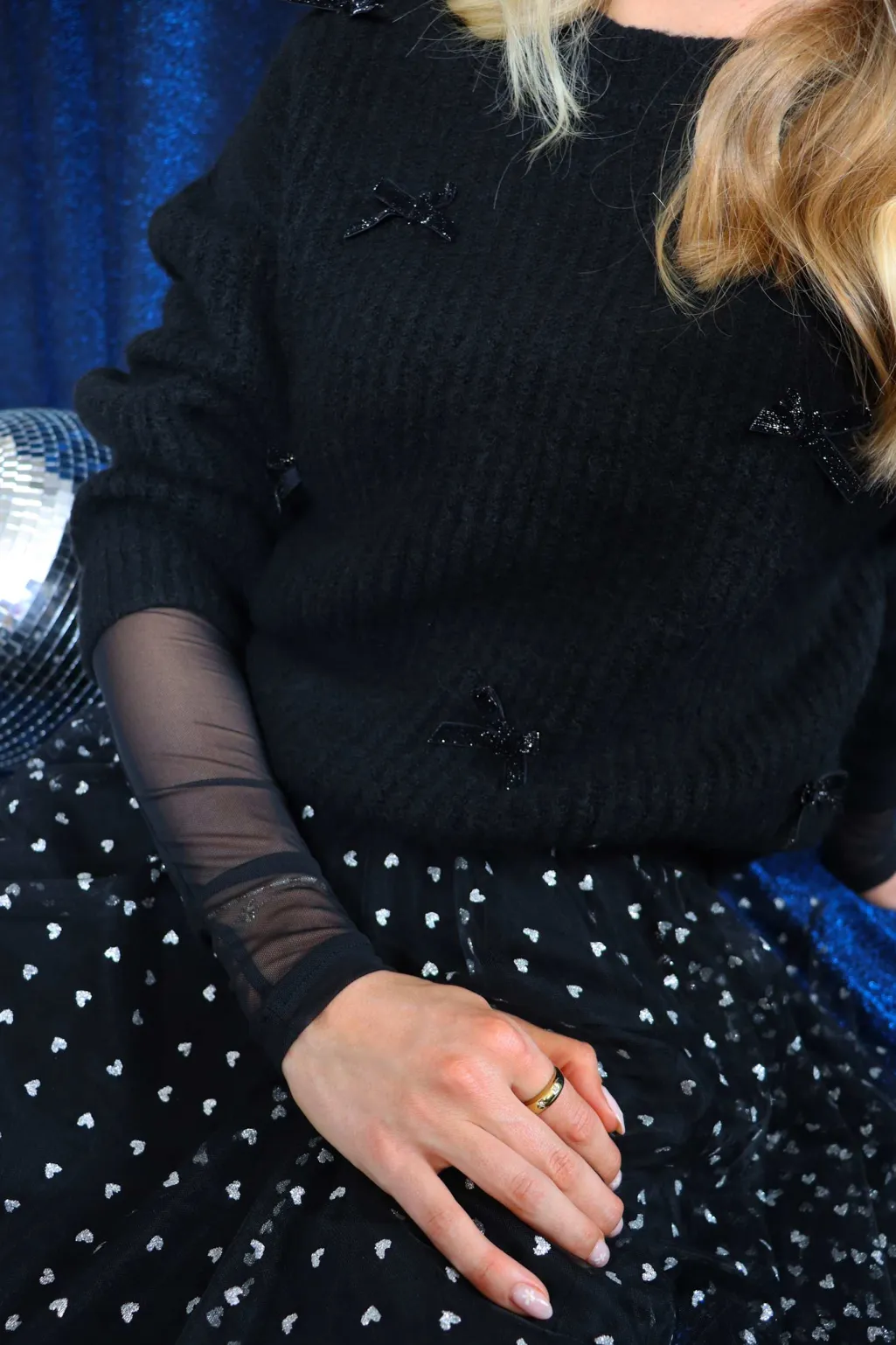 Sort pullover fra Liberte med dekorative sløjfer og pailletter. Pulloveren har lange ærmer og en rund hals.