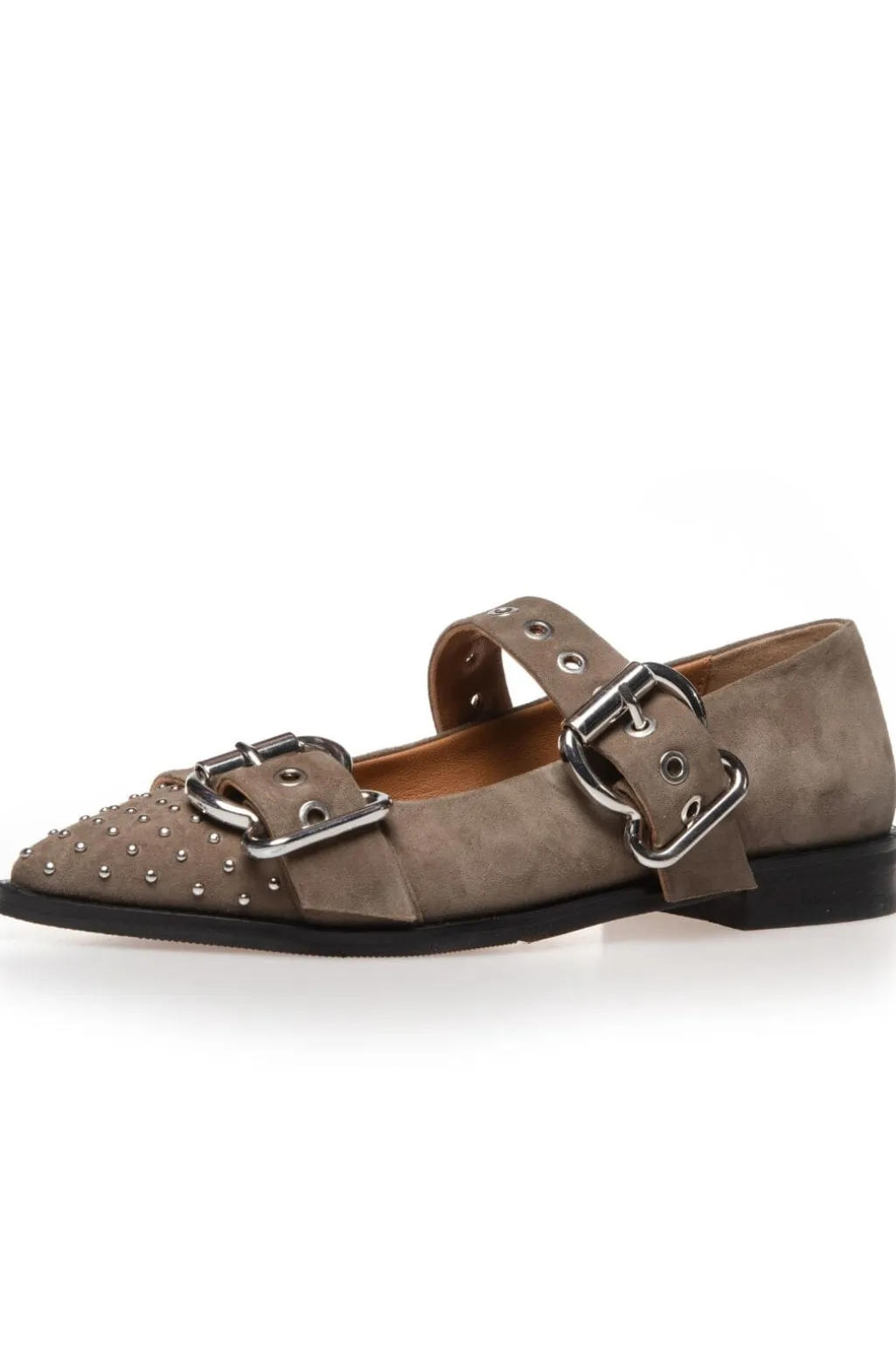 Grønne ballerinasko i ruskind fra Copenhagen Shoes. De spidse tæer med nitter giver skoene et råt udtryk, mens spænde-lukningen sikrer en god pasform.