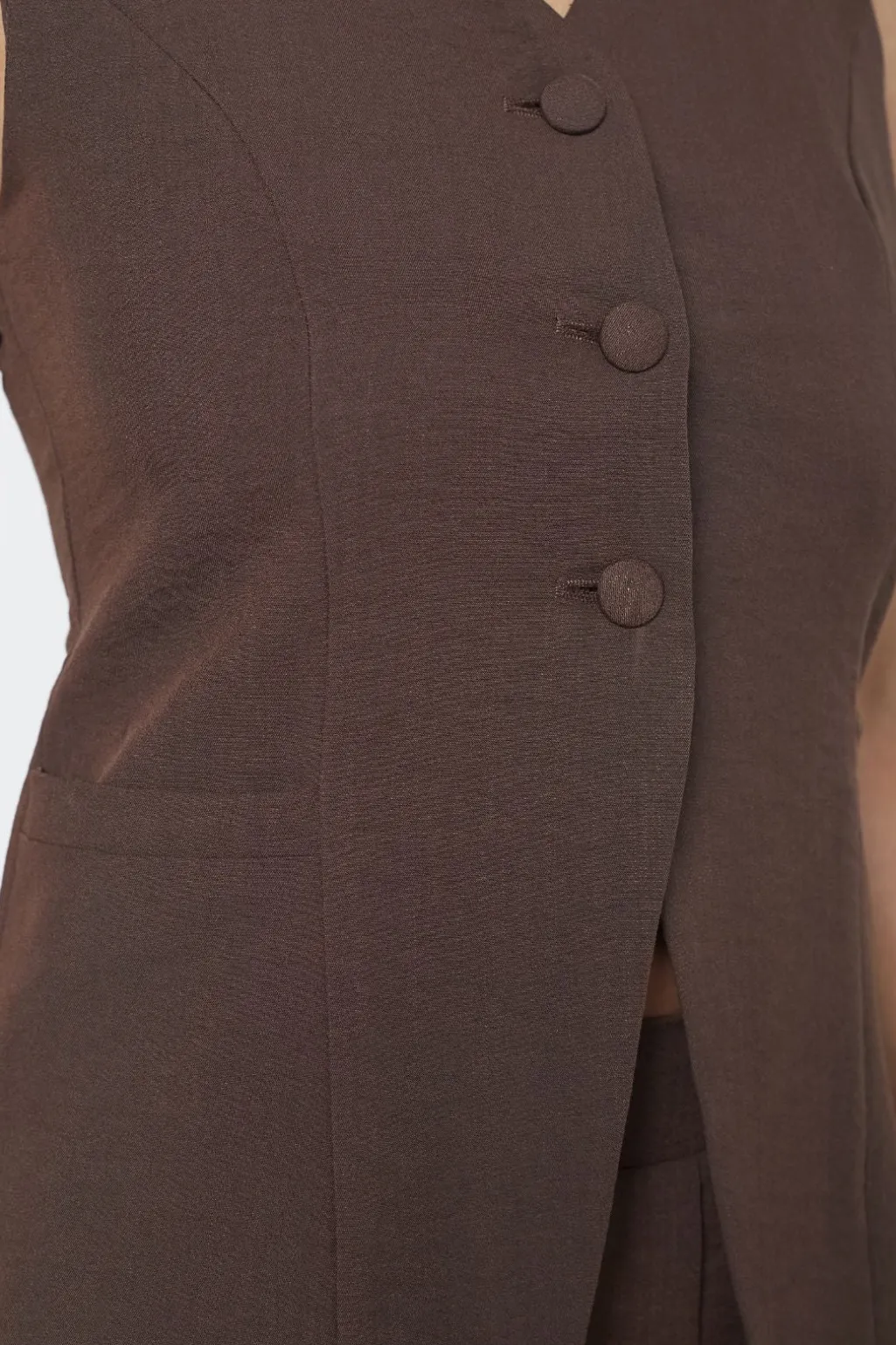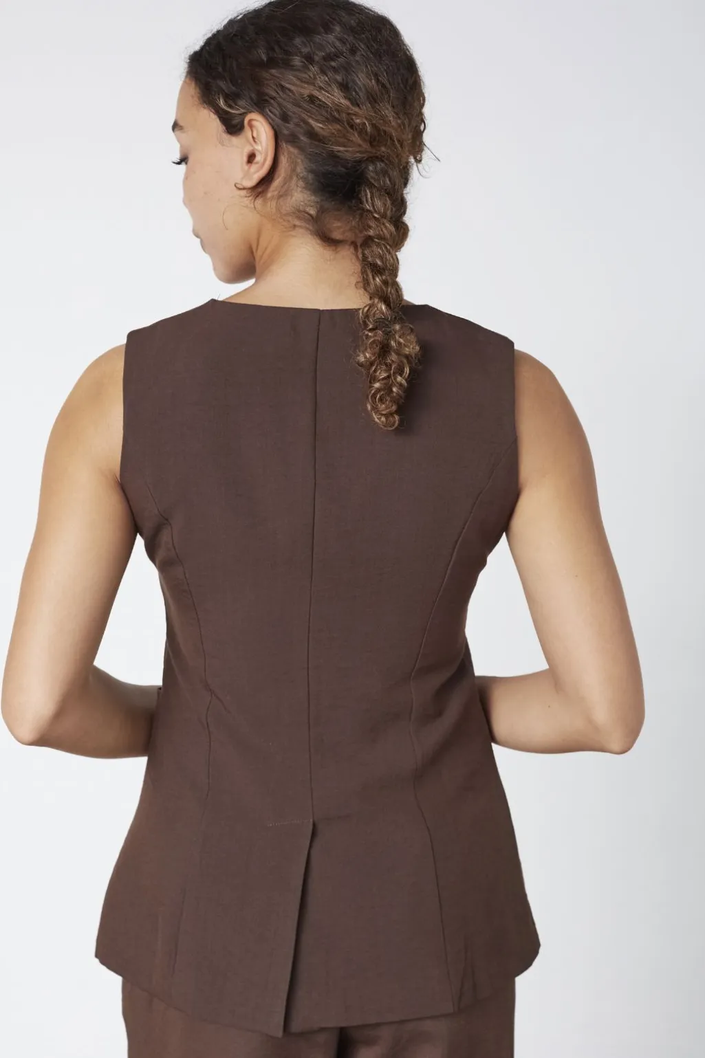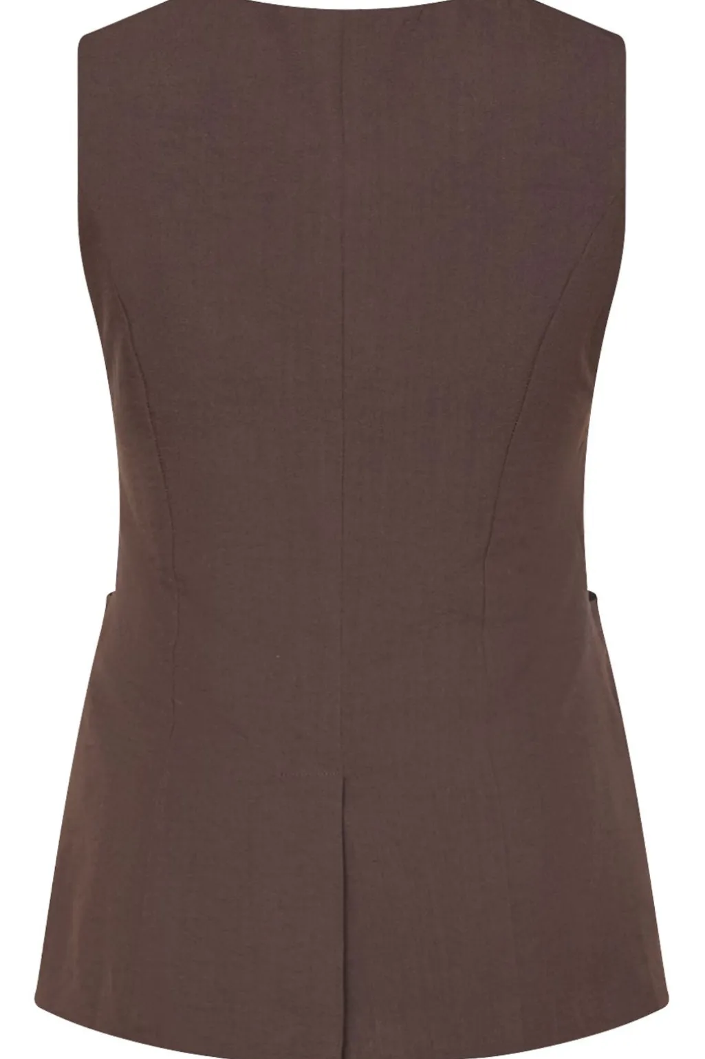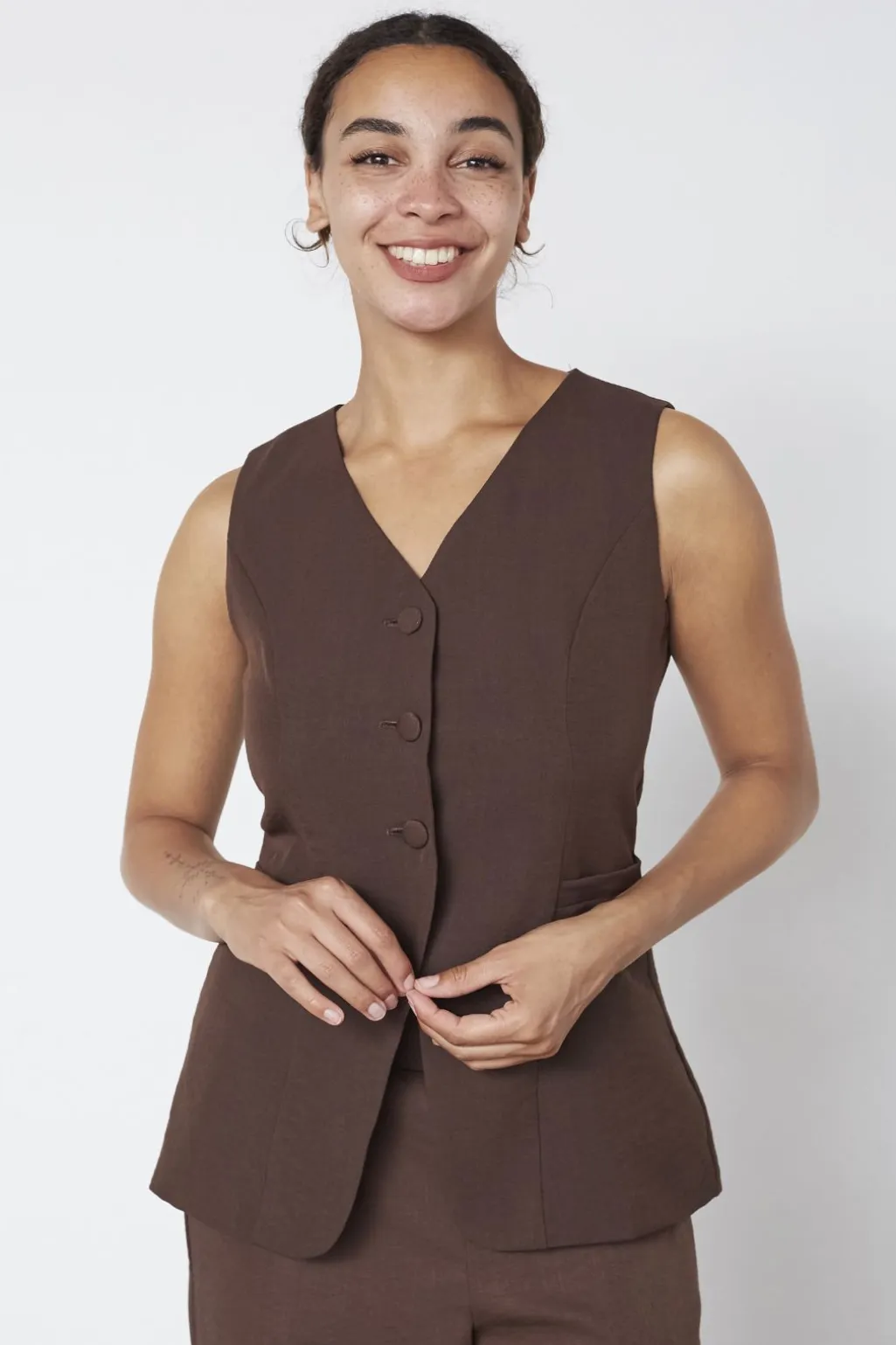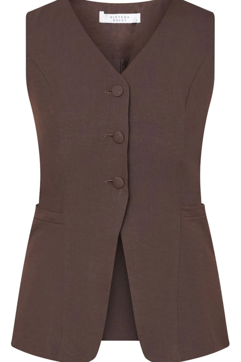 Brun vest fra Sisters Point med V-hals og tre knapper foran. Vesten er ærmeløs og har en tætsiddende pasform.