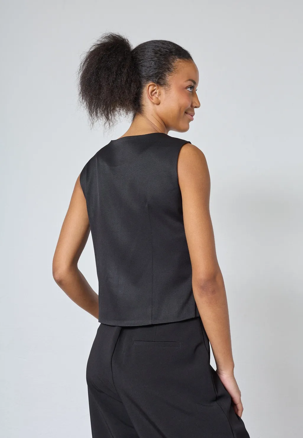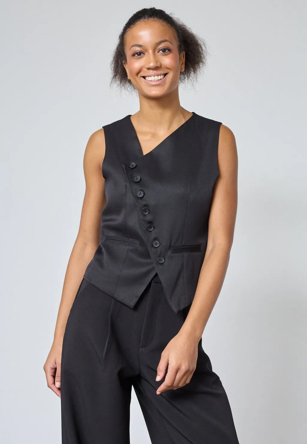 Sort vest fra Sisters Point med asymmetrisk knaplukning langs fronten. Vesten har en V-hals og et ærmeløst design med to dekorative lommer.