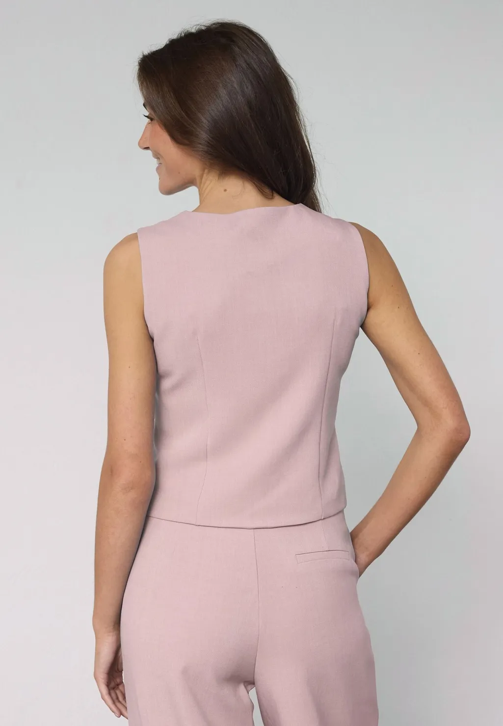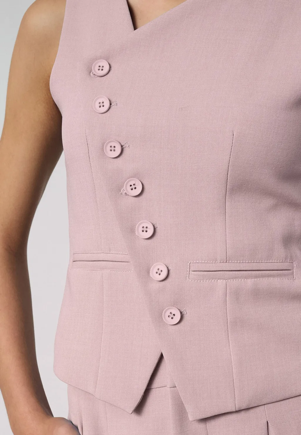 Lilla vest fra Sisters Point, lavet af 92 % polyester og 8 % elastan. Vesten har et asymmetrisk design med syv knapper langs fronten.