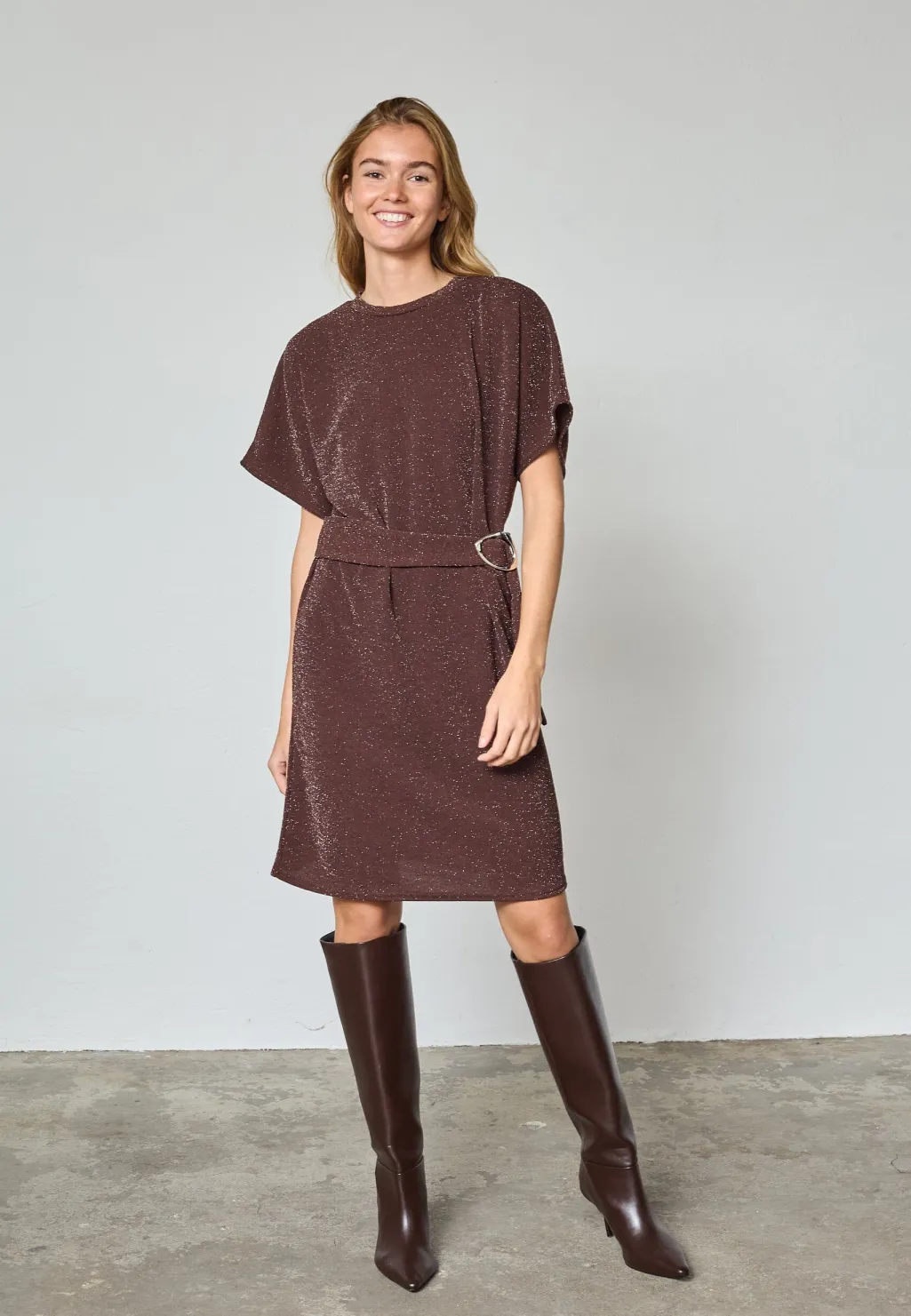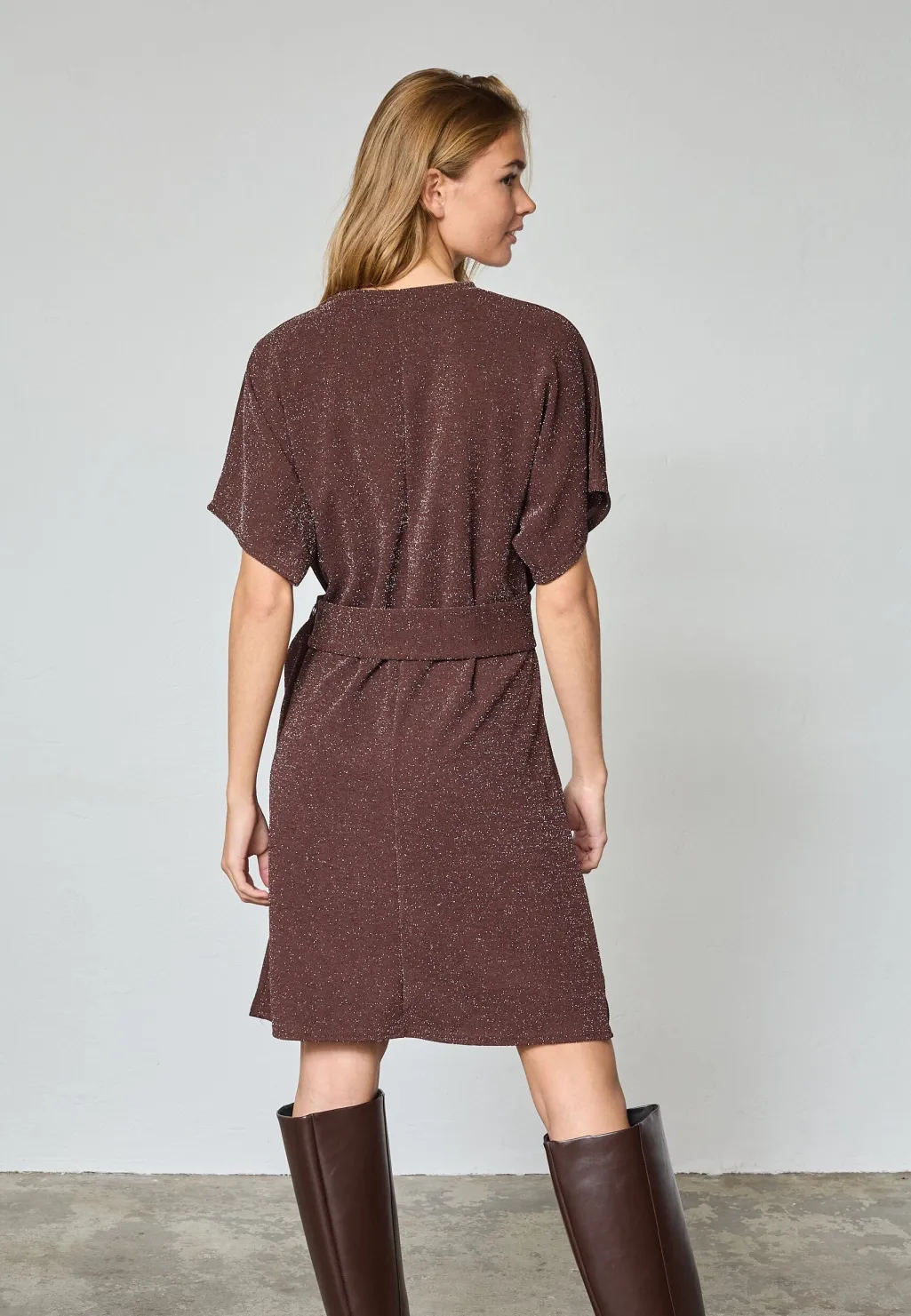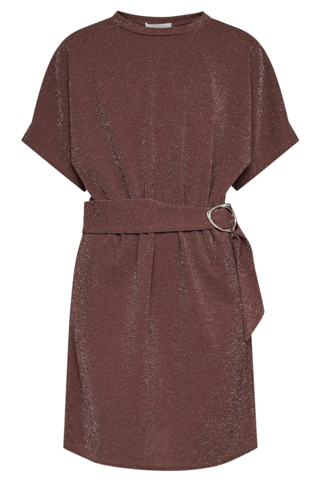 Brun kjole fra Sisters Point med en struktureret overflade, hvor skinnende sølvfarvede tråde giver kjolen et festligt udtryk.