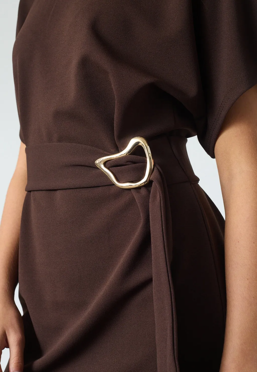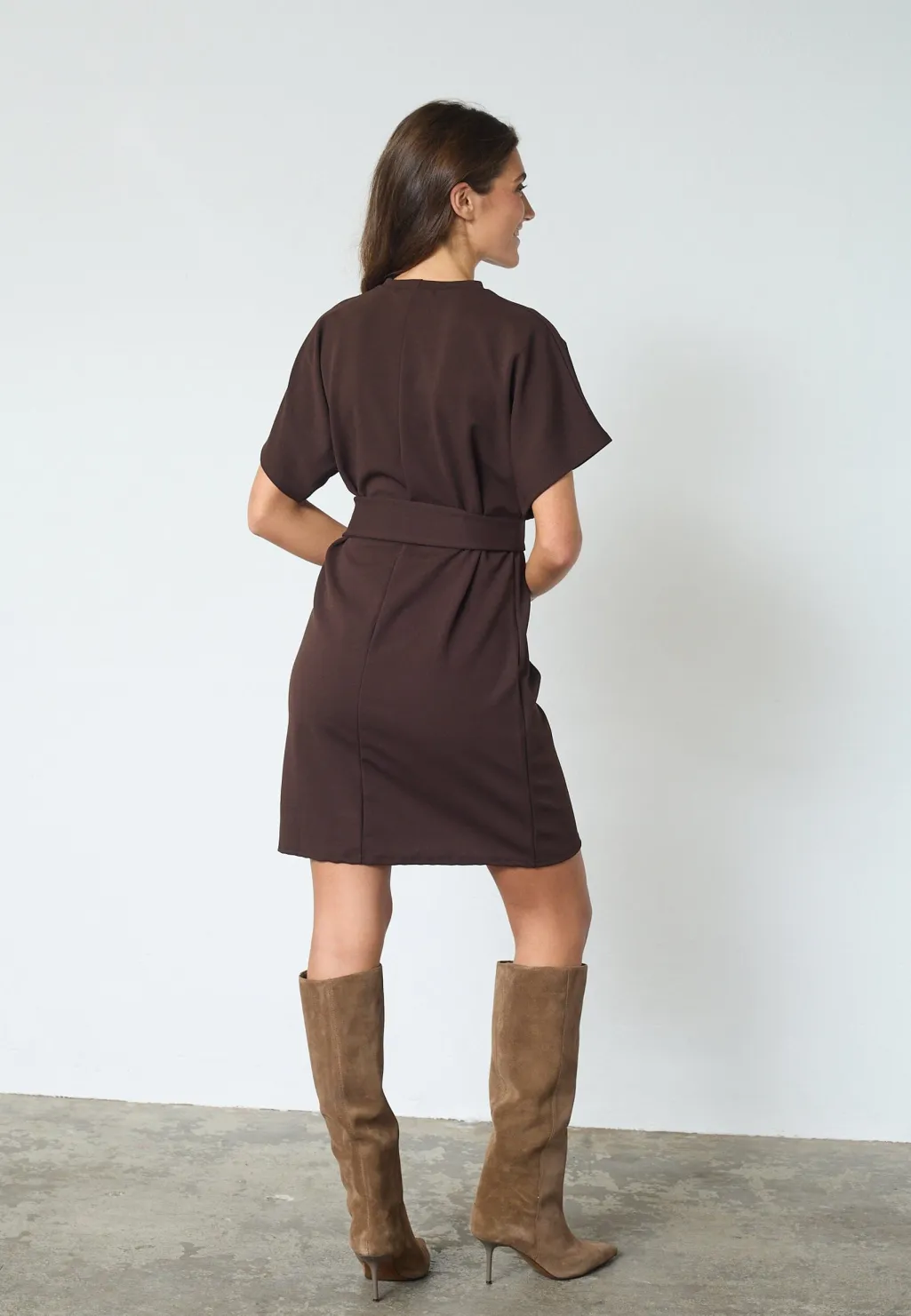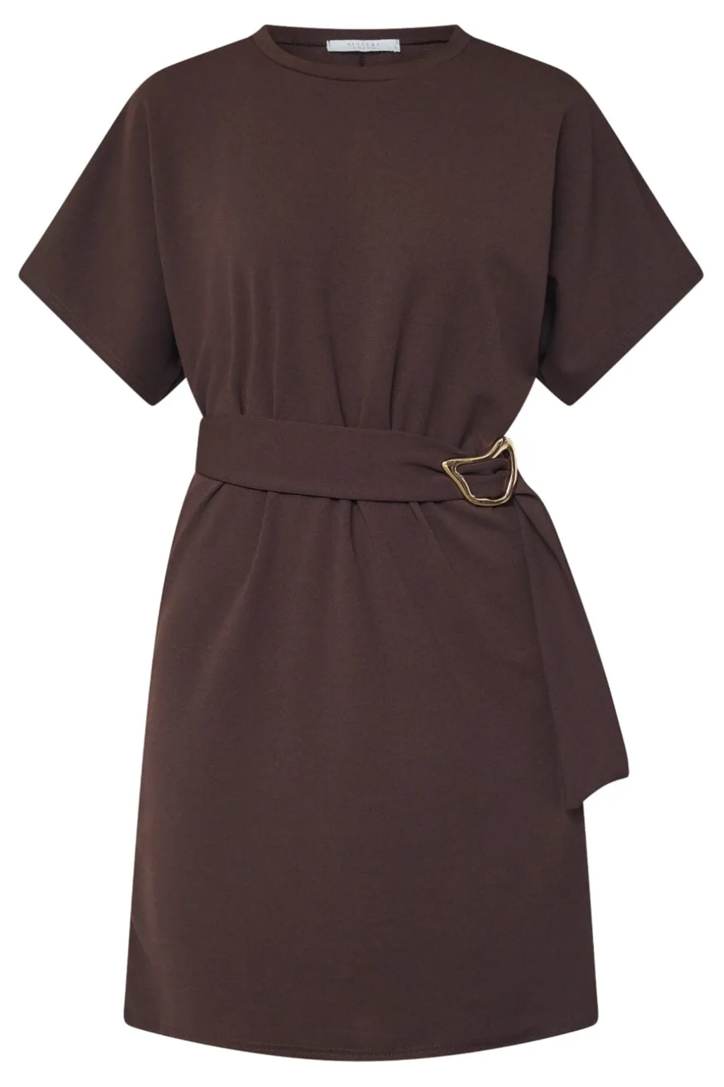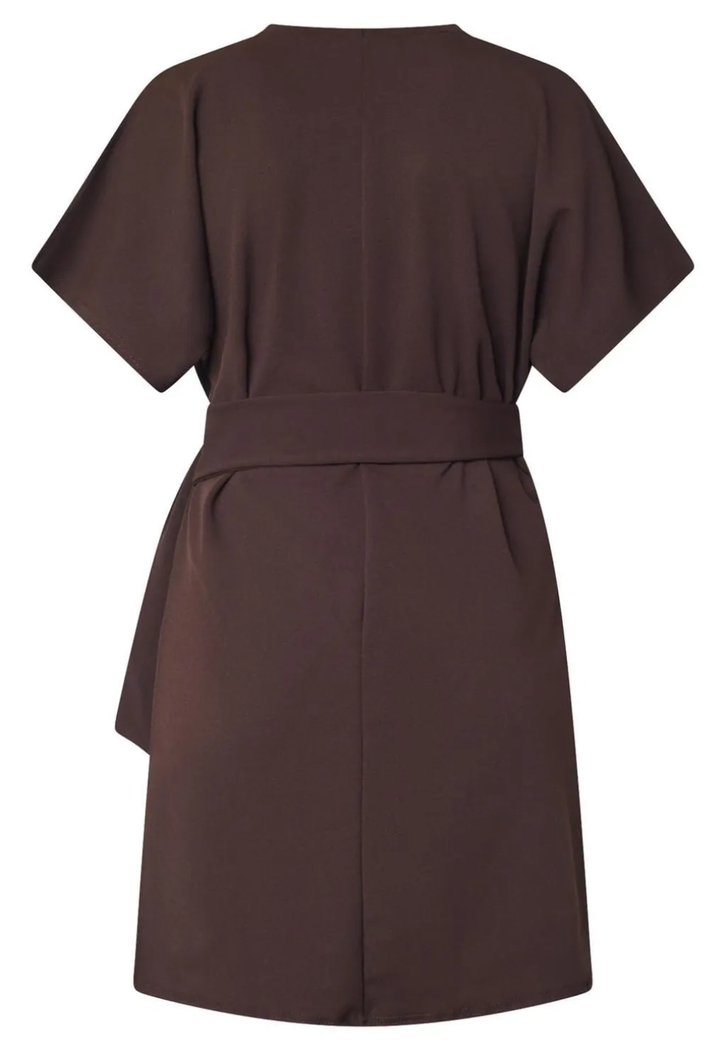 Mørk chokoladebrun kjole fra Sisters Point. Kjolen passer til både hverdagen og festlige lejligheder med sin løse pasform og justerbare bælte.