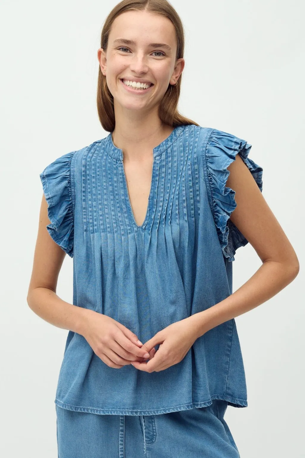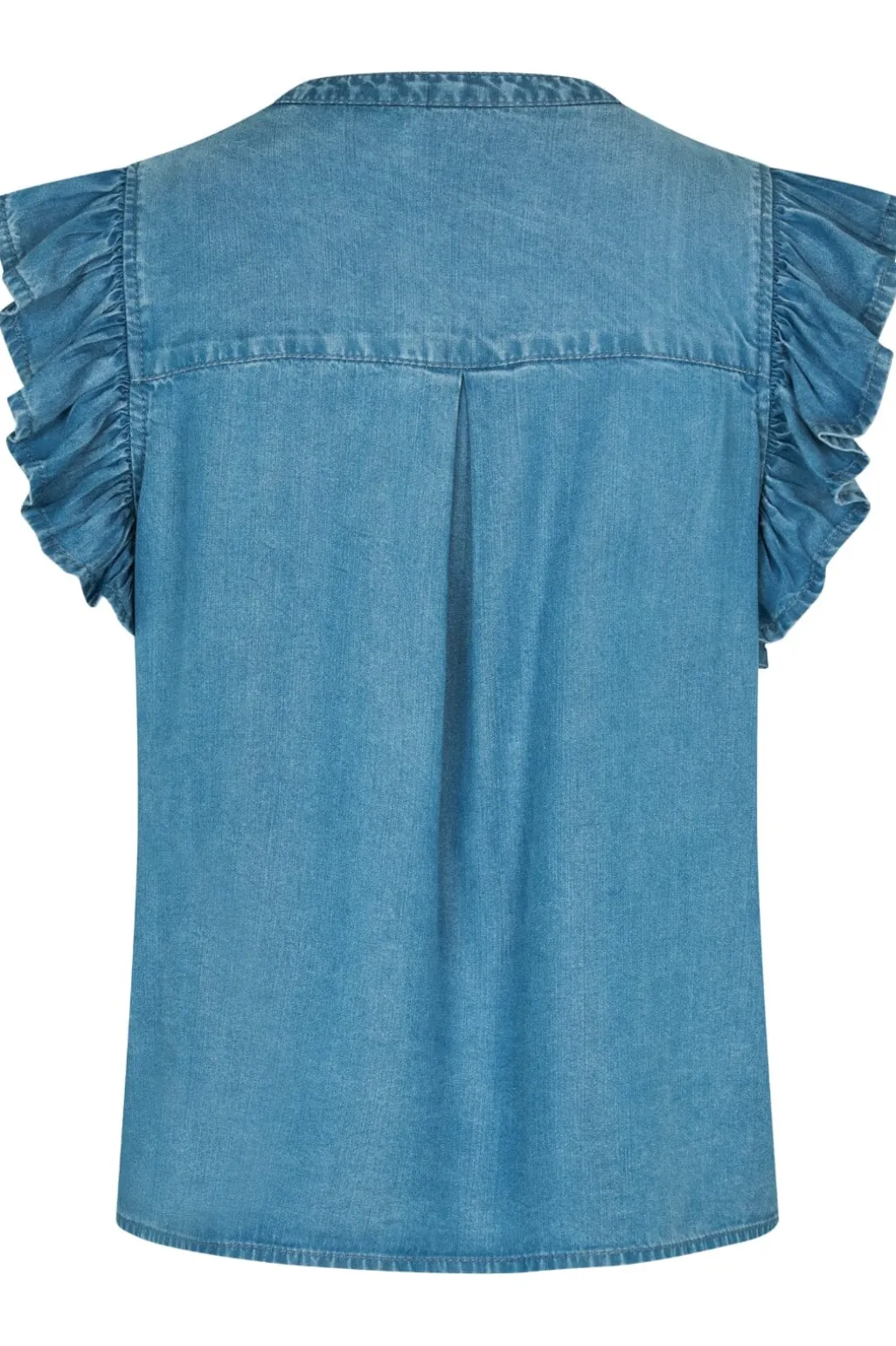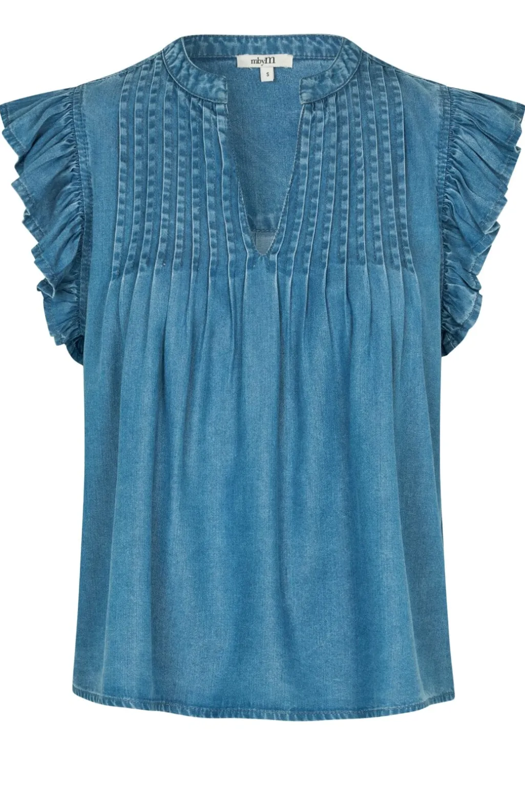 Denimbluse fra MbyM i en mid vintage vask. Blusen har flæseærmer, plisseret front og v-halsudskæring, der giver et feminint præg.