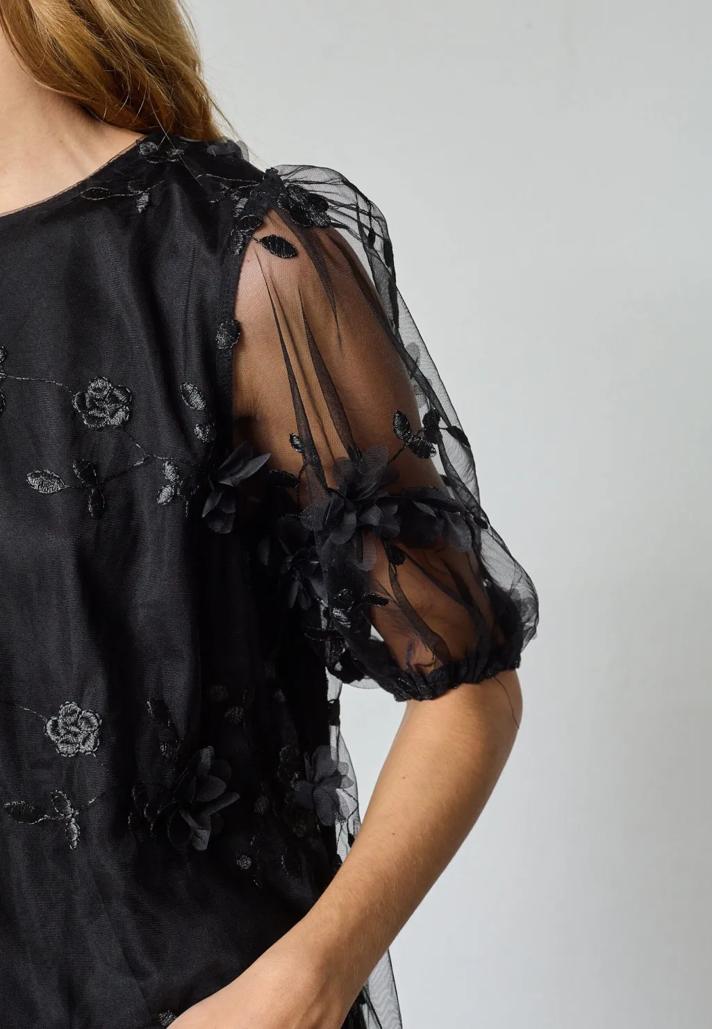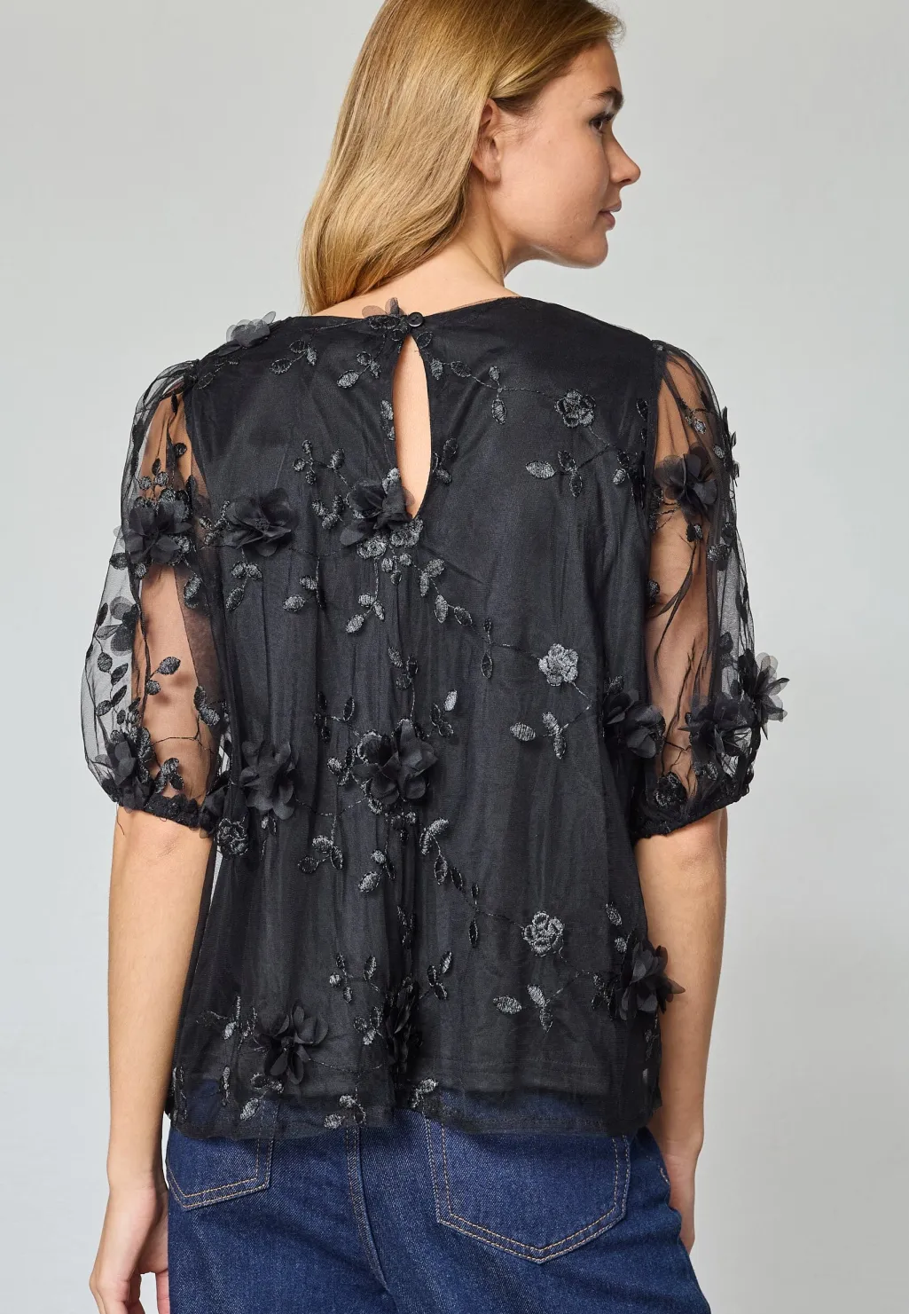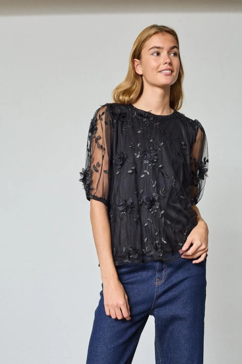 Sort bluse fra Sisters Point, lavet af gennemsigtigt stof med blomsterbroderier over hele overfladen. Blusen har korte, løstsiddende ærmer og en rund hals.