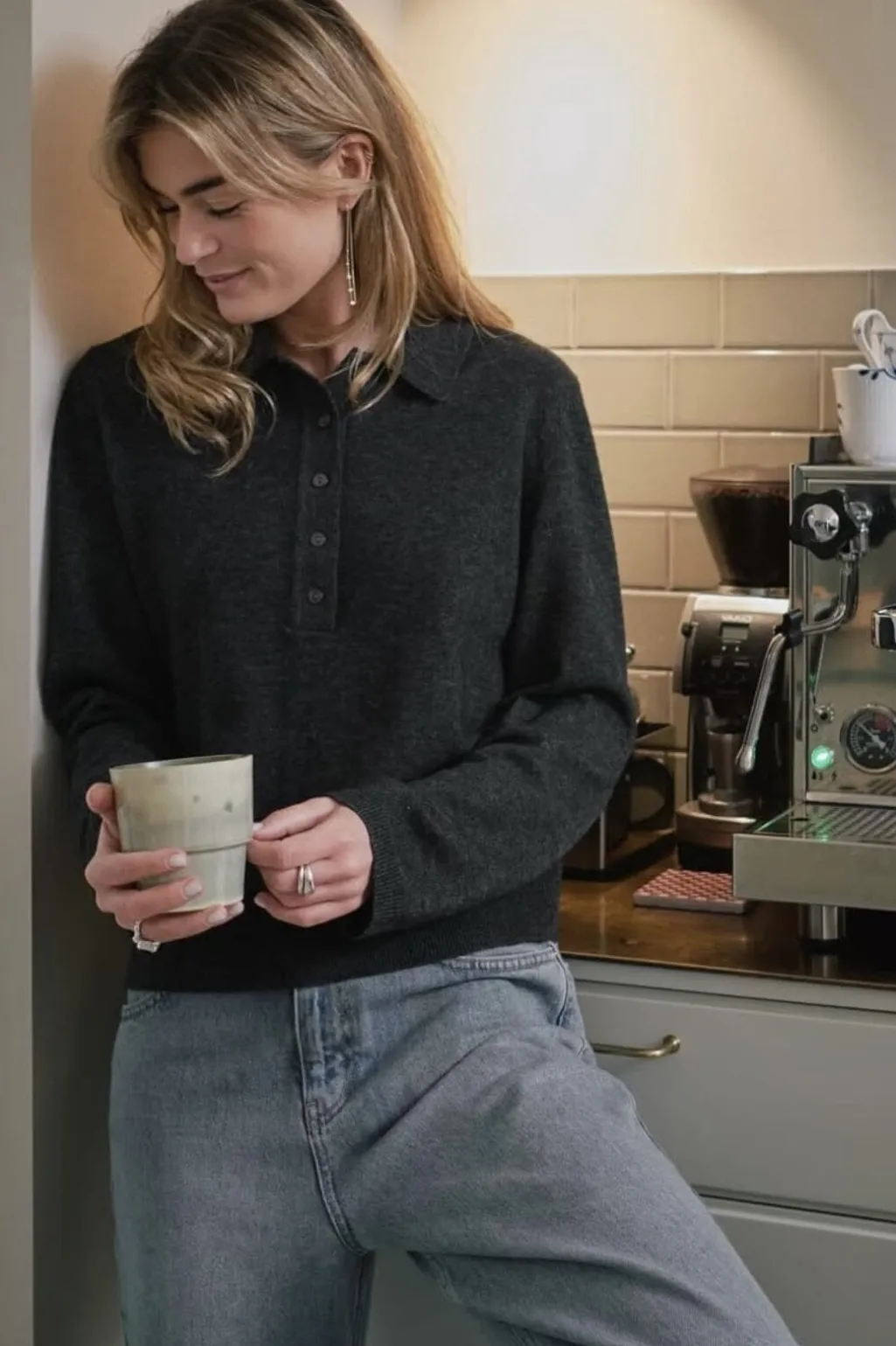 Strikket polo-bluse fra Neo Noir i antracitfarve. Blusen har lange ærmer med ribbede manchetter og en klassisk polokrave med knaplukning foran.