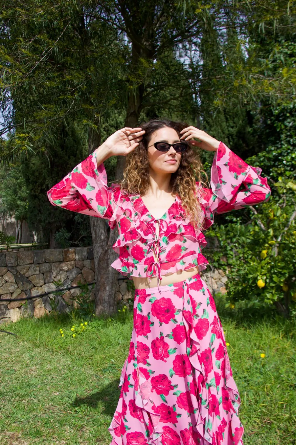 Bluse fra Cras i lyserød med store rosemønstre. Den har flæsedetaljer langs ærmerne og halsudskæringen, bindebånd foran og en V-halsudskæring. Blusen matcher Georgia-nederdelen.
