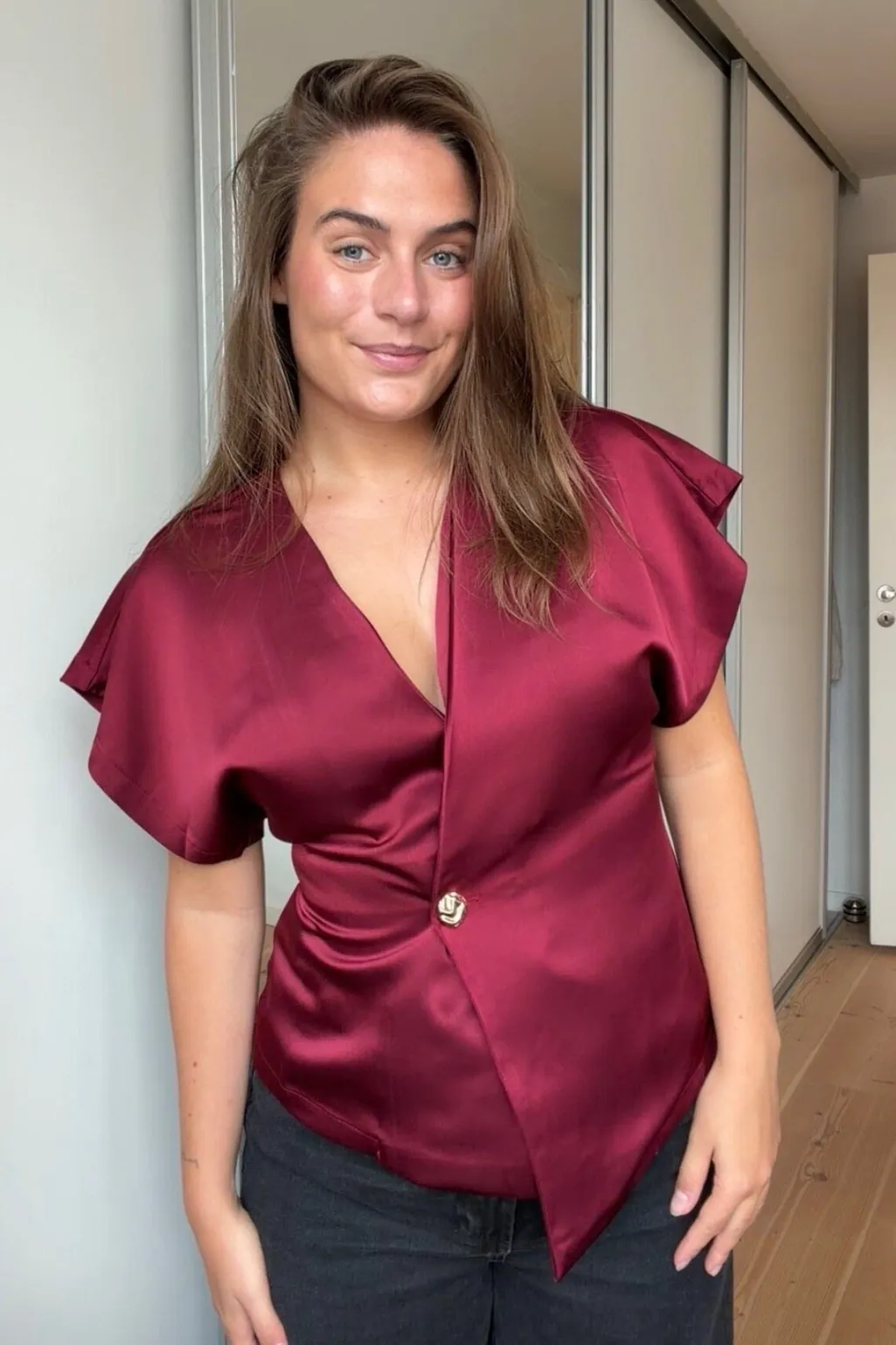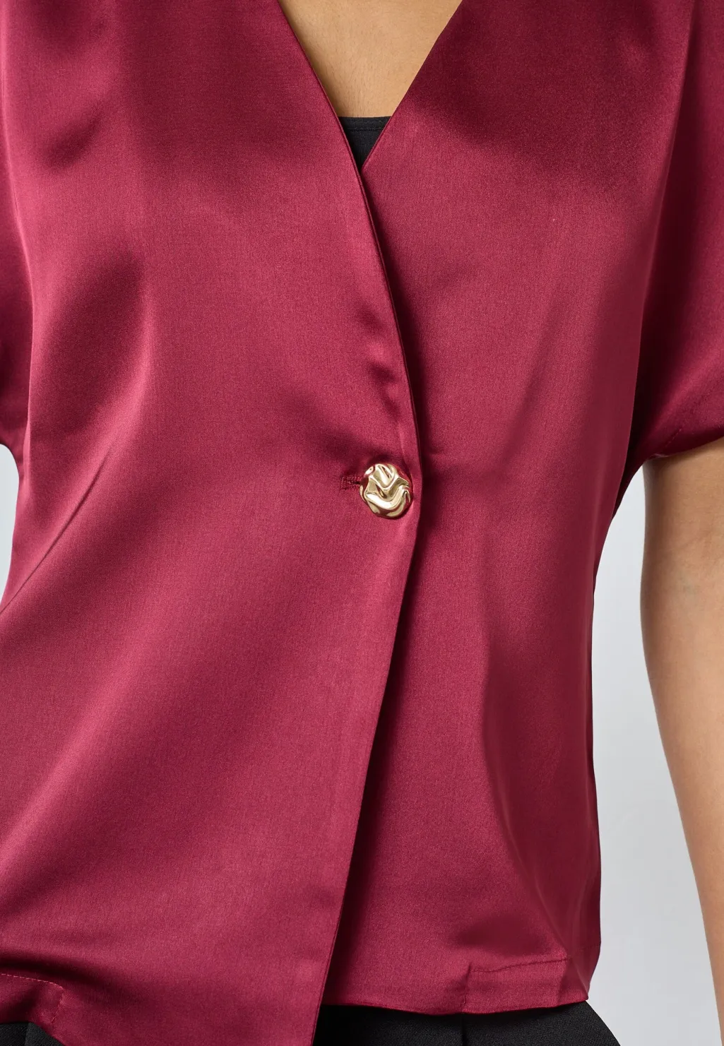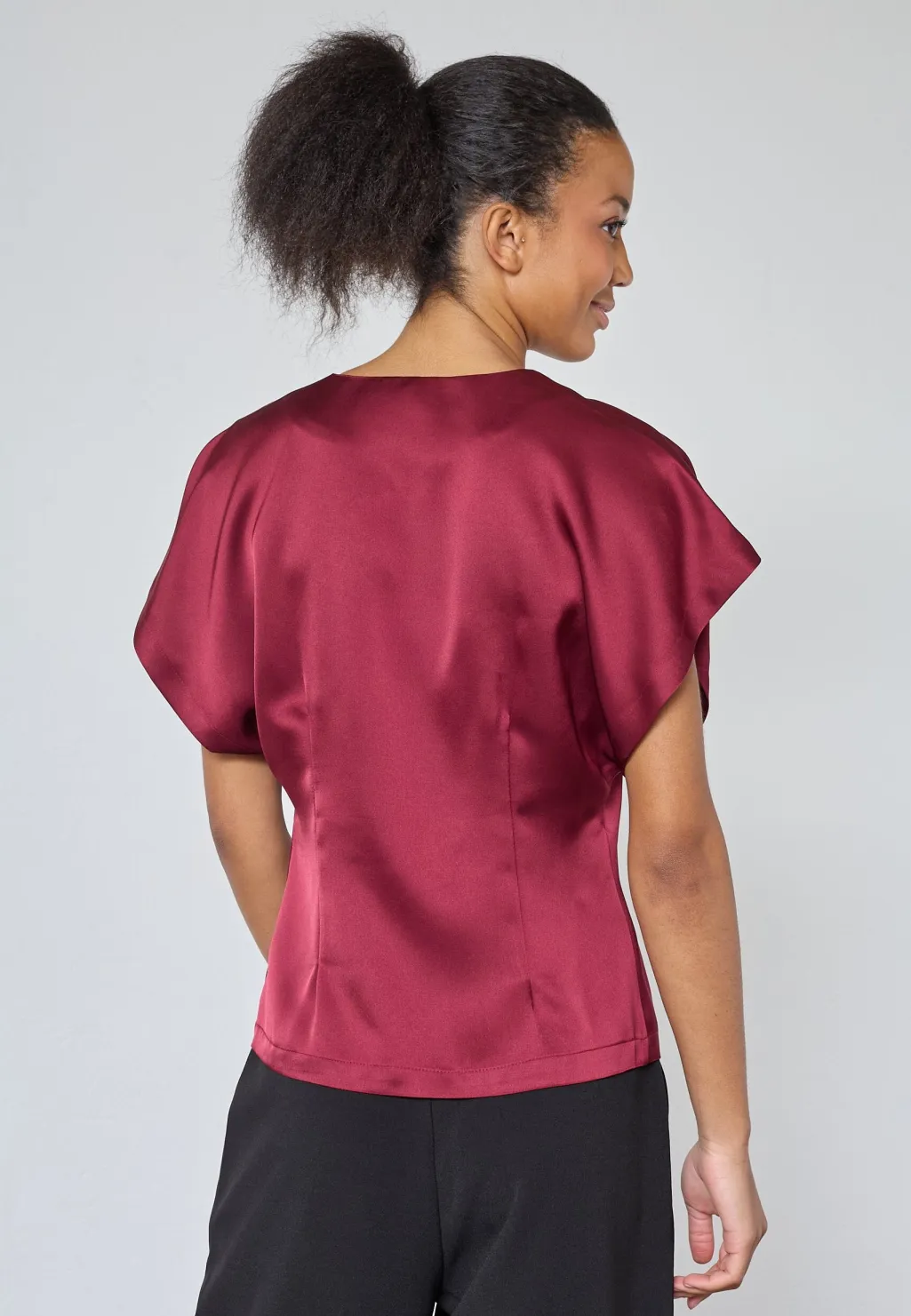 Bluse fra Sisters Point i vinrød. Blusen er lavet af 100 % polyester med en glat og skinnende overflade.