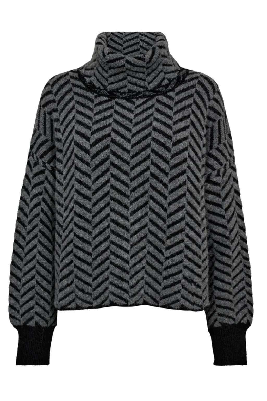 Sweater fra Gossia med et zigzagmønster i sort og grå. Strikken har en høj hals, lange ærmer og en oversize pasform. Den er lavet i en blød kvalitet.