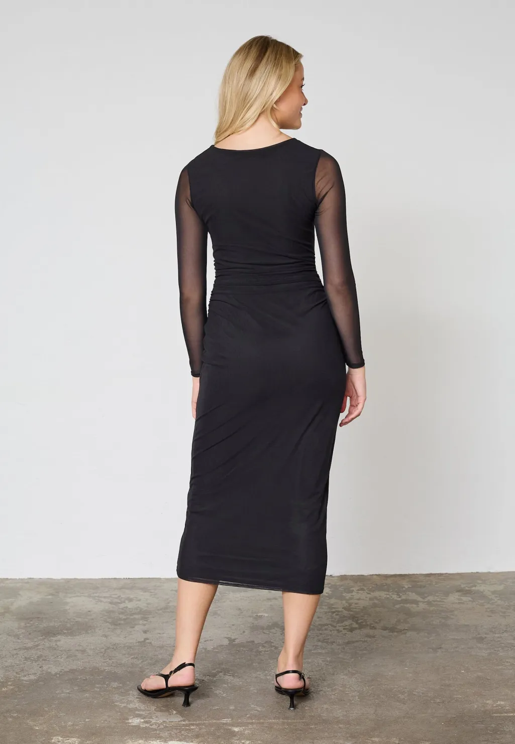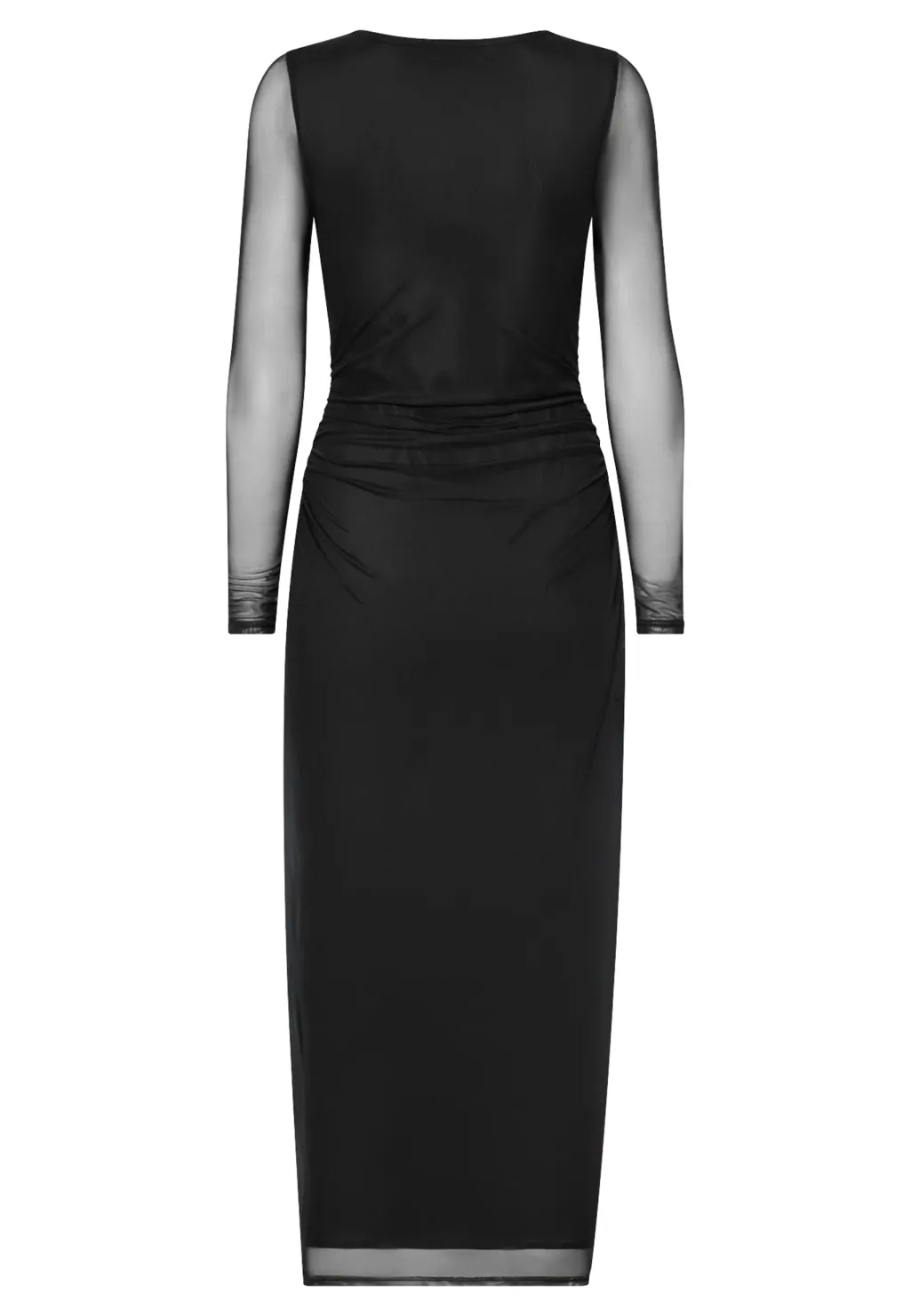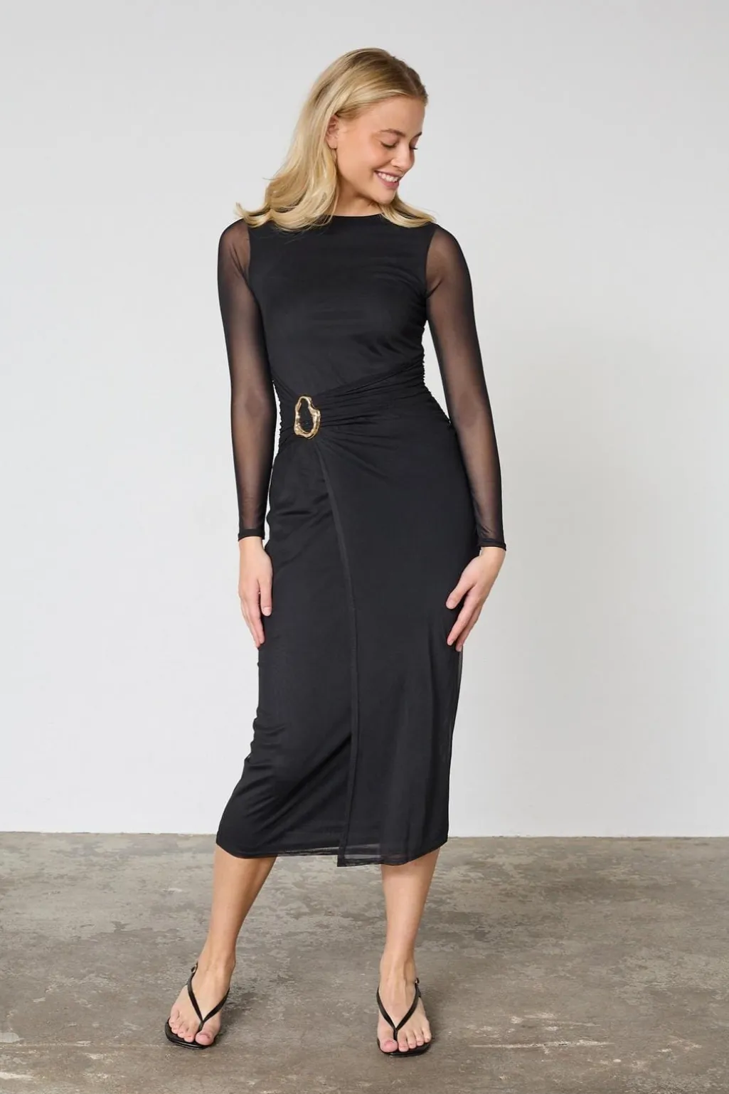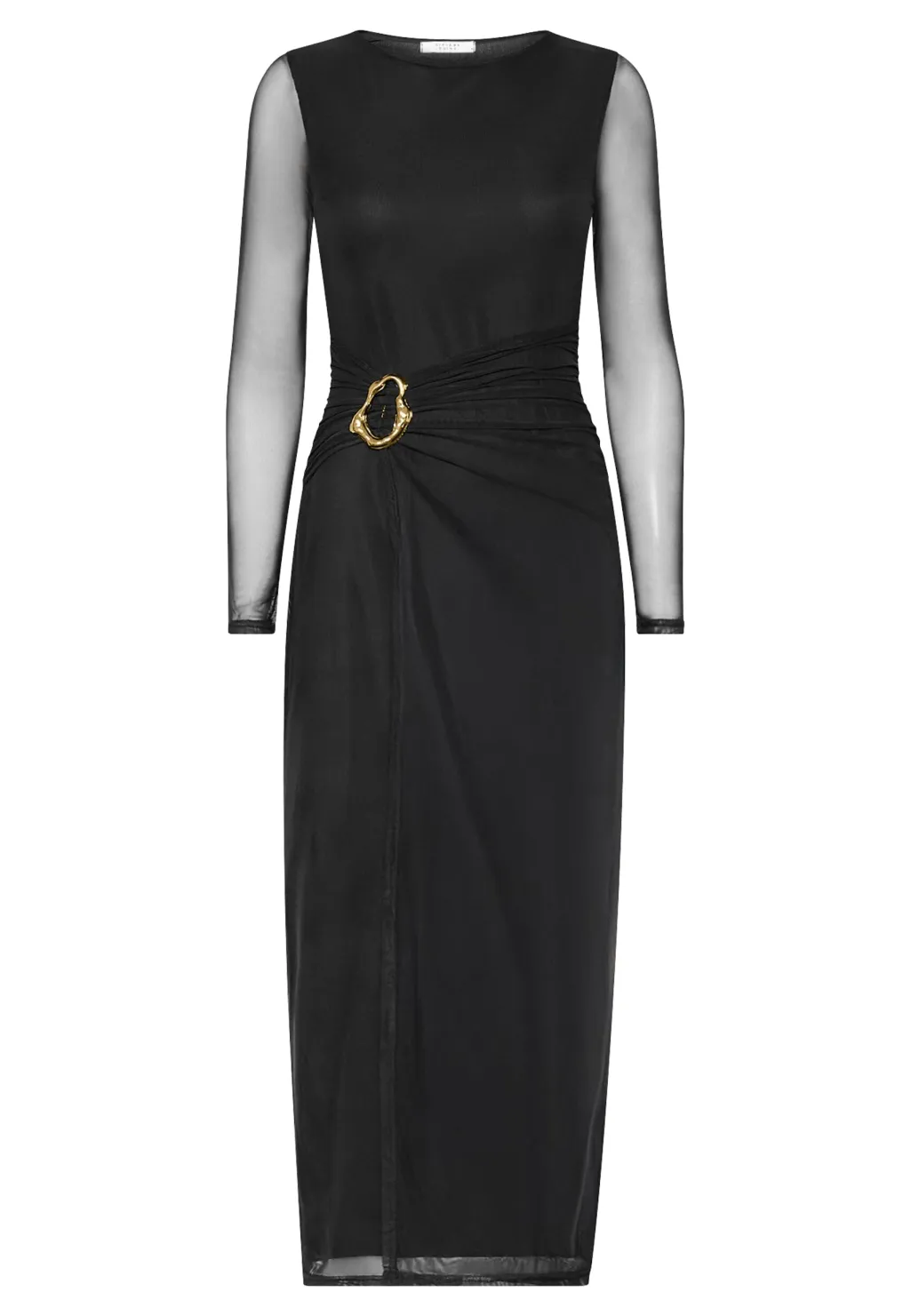 Sort midi-kjole fra Sisters Point med tætsiddende pasform. Kjolen har gennemsigtige ærmer og et guldfarvet spænde i taljen, der samler stoffet på en flot måde.