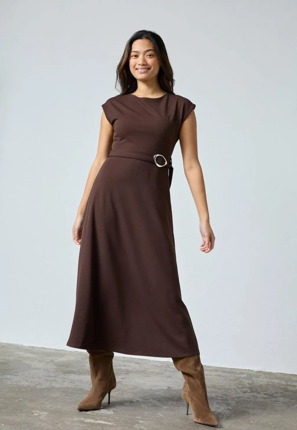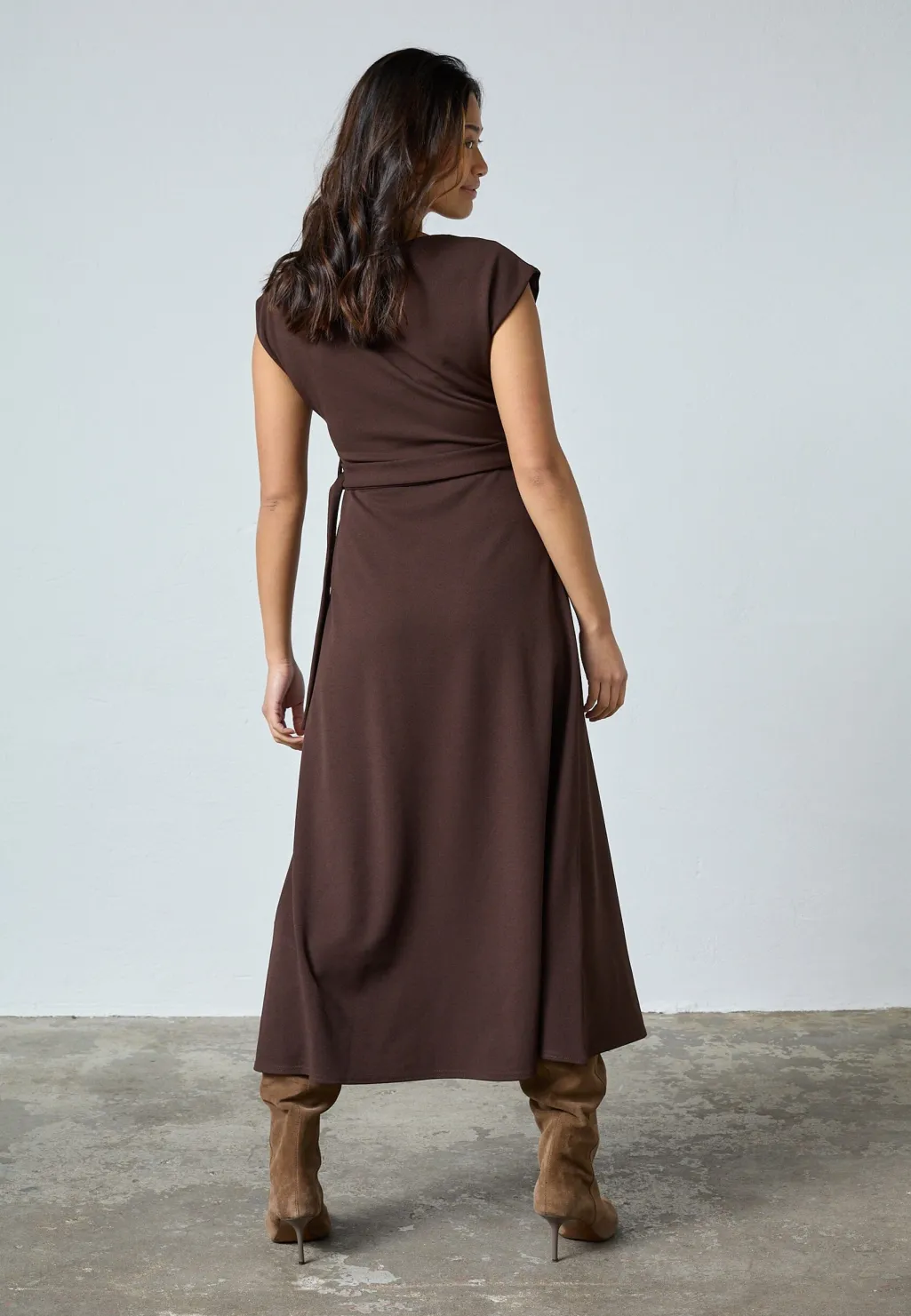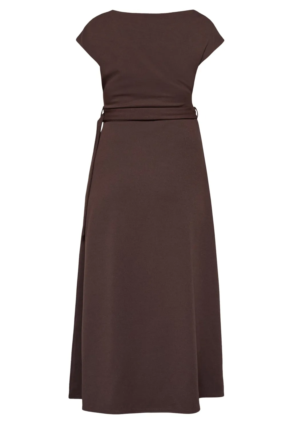 Mellemlang kjole fra Sisters Point i en dyb chokoladebrun farve. Kjolen er lavet af glat polyester, der falder tungt og giver en struktureret silhuet.