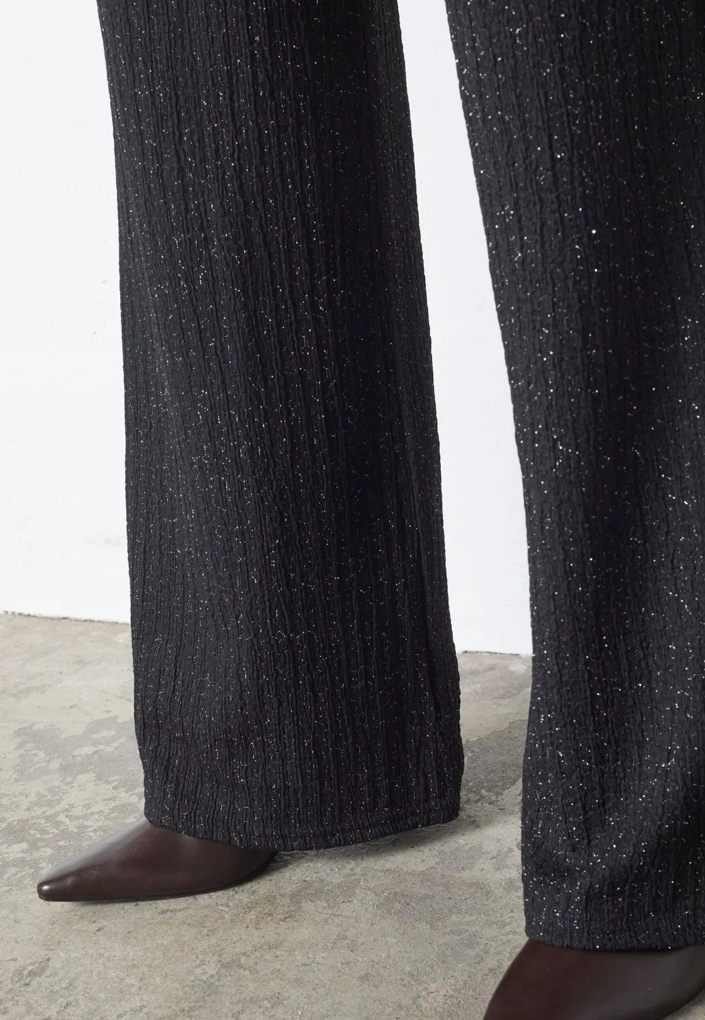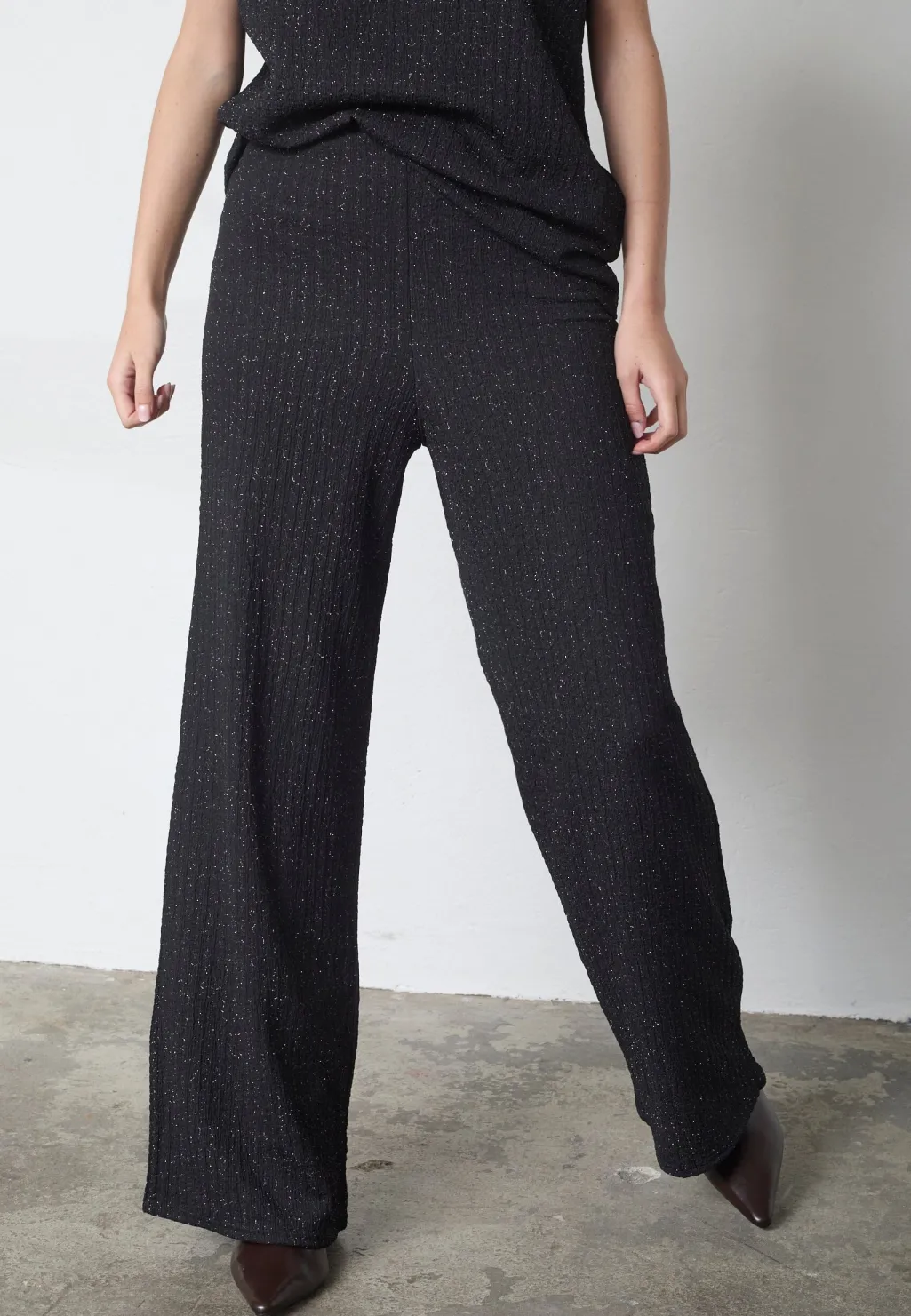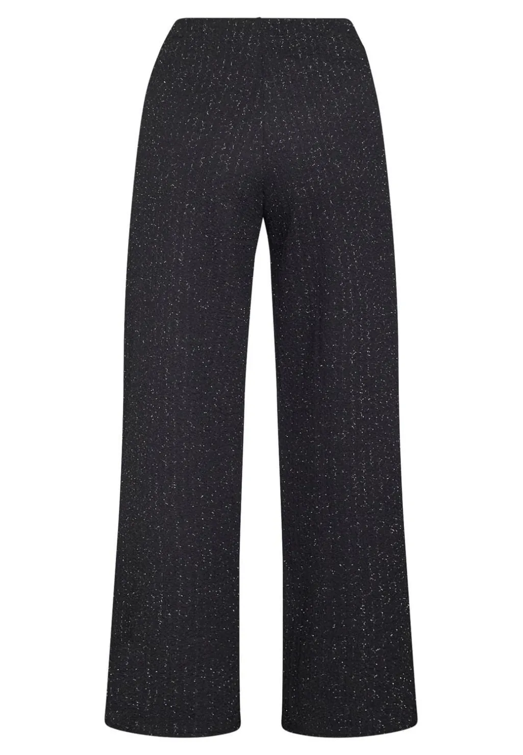 Sorte bukser fra Sisters Point med sølvfarvede, skinnende tråde. Bukserne har en gulvlang længde, høj talje og løs pasform med bred benvidde.