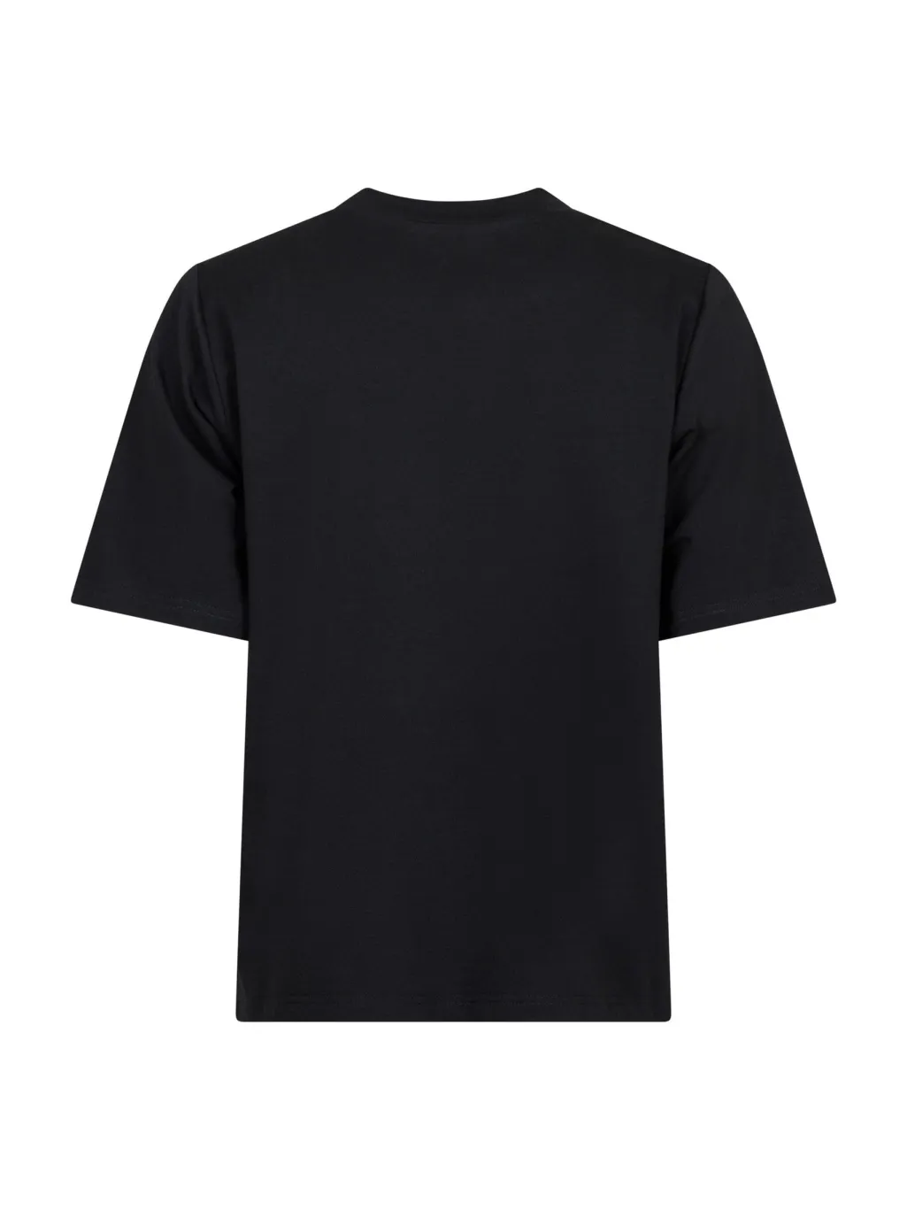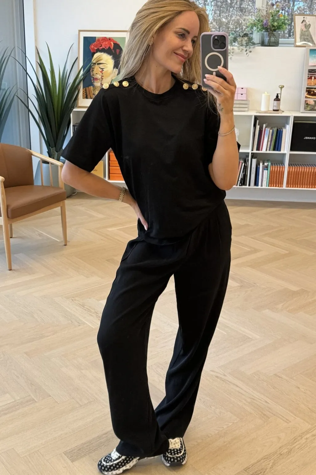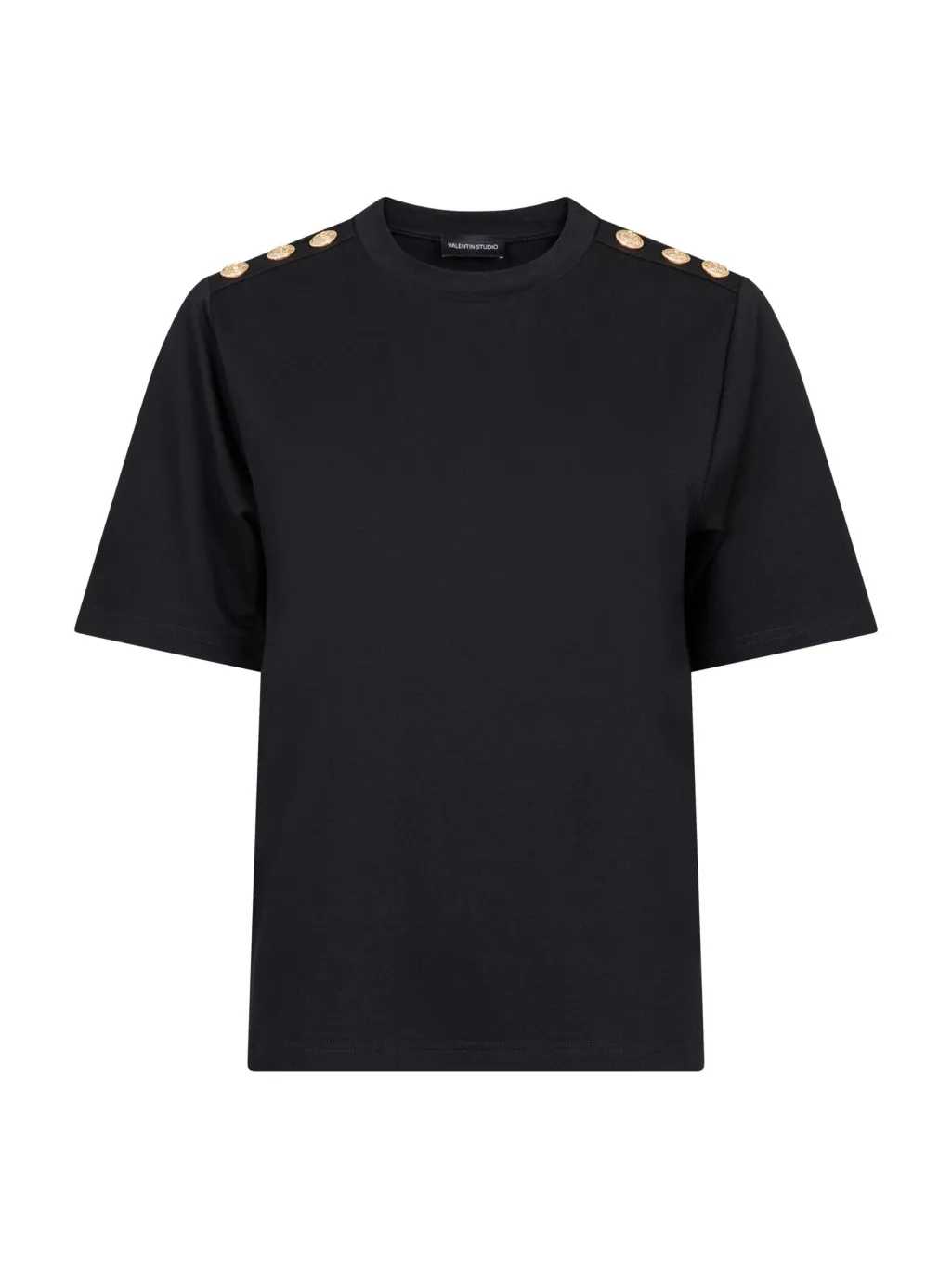 Sort t-shirt fra Valentin Studio med guldknapper på skuldrene. T-shirten har en løs pasform og rund hals, hvilket giver god bevægelsesfrihed.