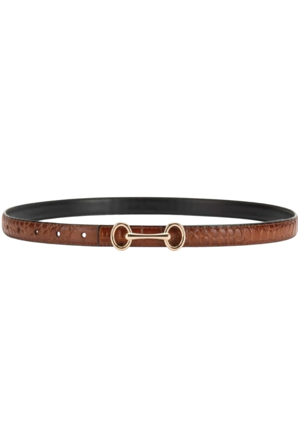 Bælte fra Plissé Copenhagen med krokodillemønsteret overflade i cognacfarvet læder. Bæltet har et guldfarvet spænde og passer til både kjoler og bukser.