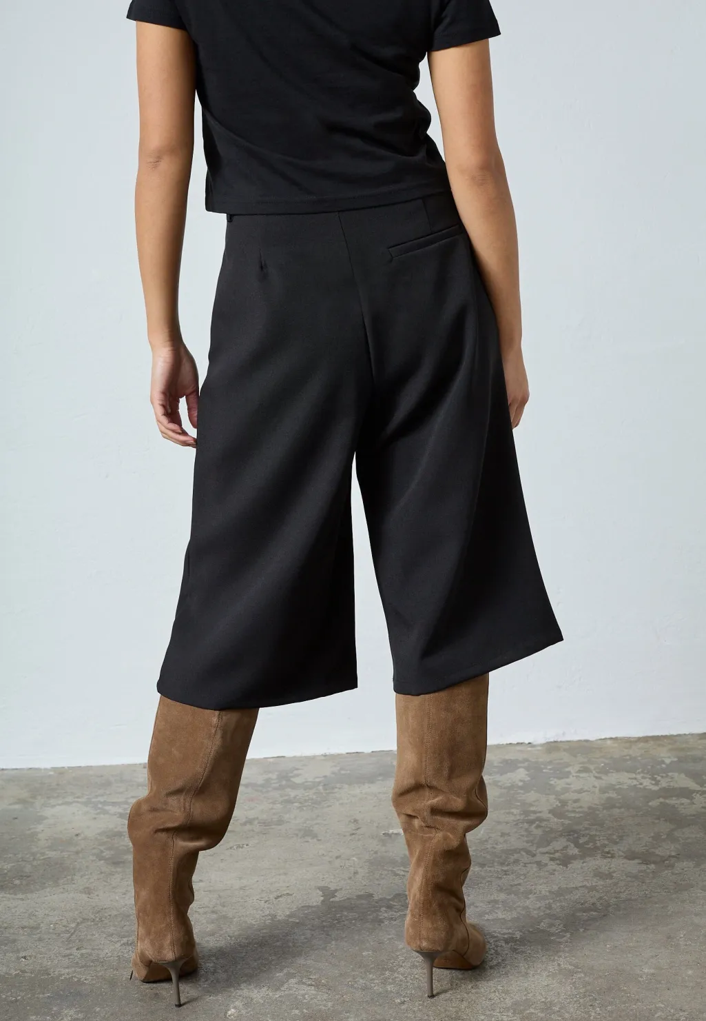 Sorte culotte-shorts fra Sisters Point med løs pasform og knælængde. Shortsene har høj talje og læg foran.