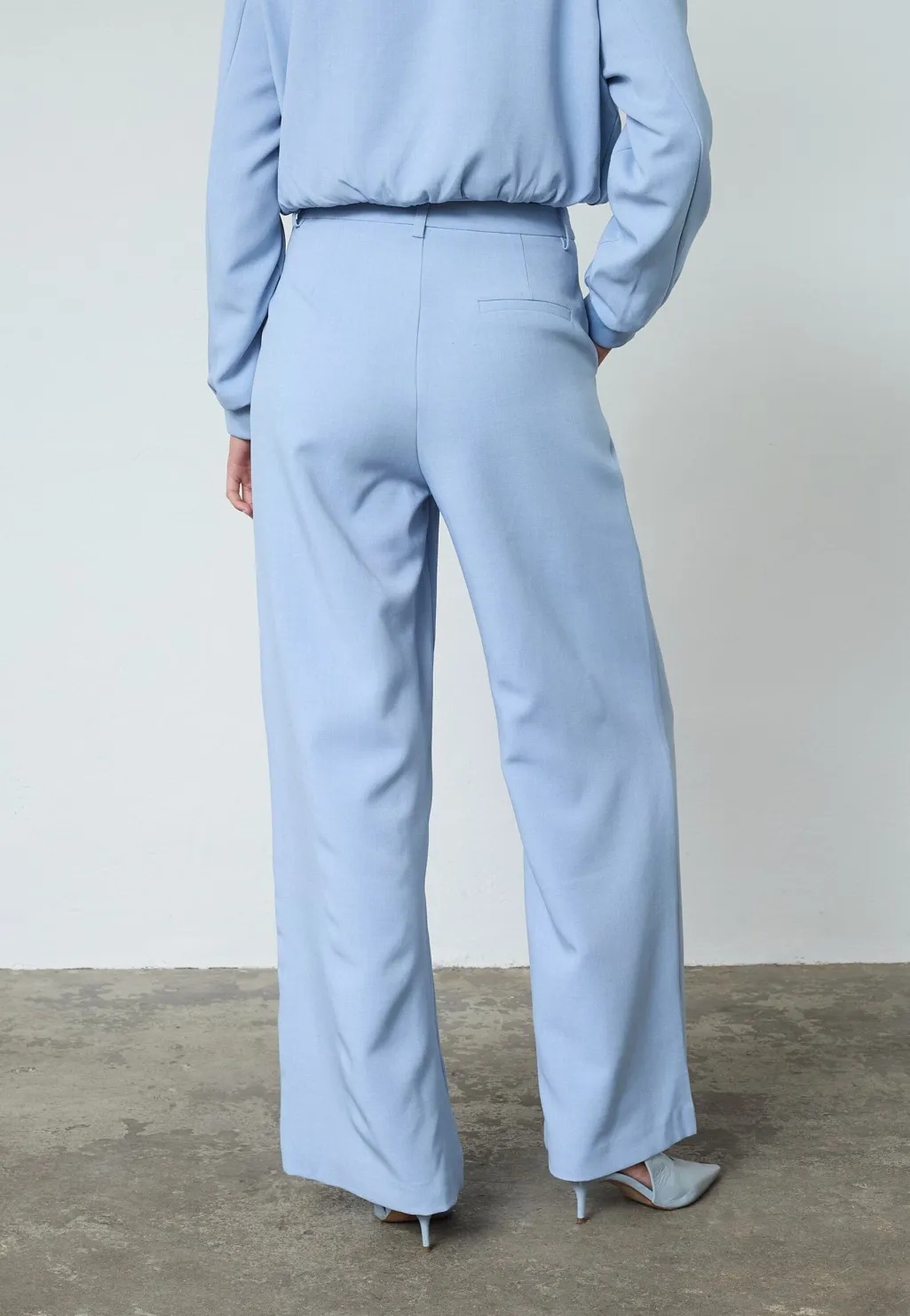 Lyseblå bukser fra Sisters Point med løs pasform og vide ben. Bukserne har en høj talje og gulvlængde.