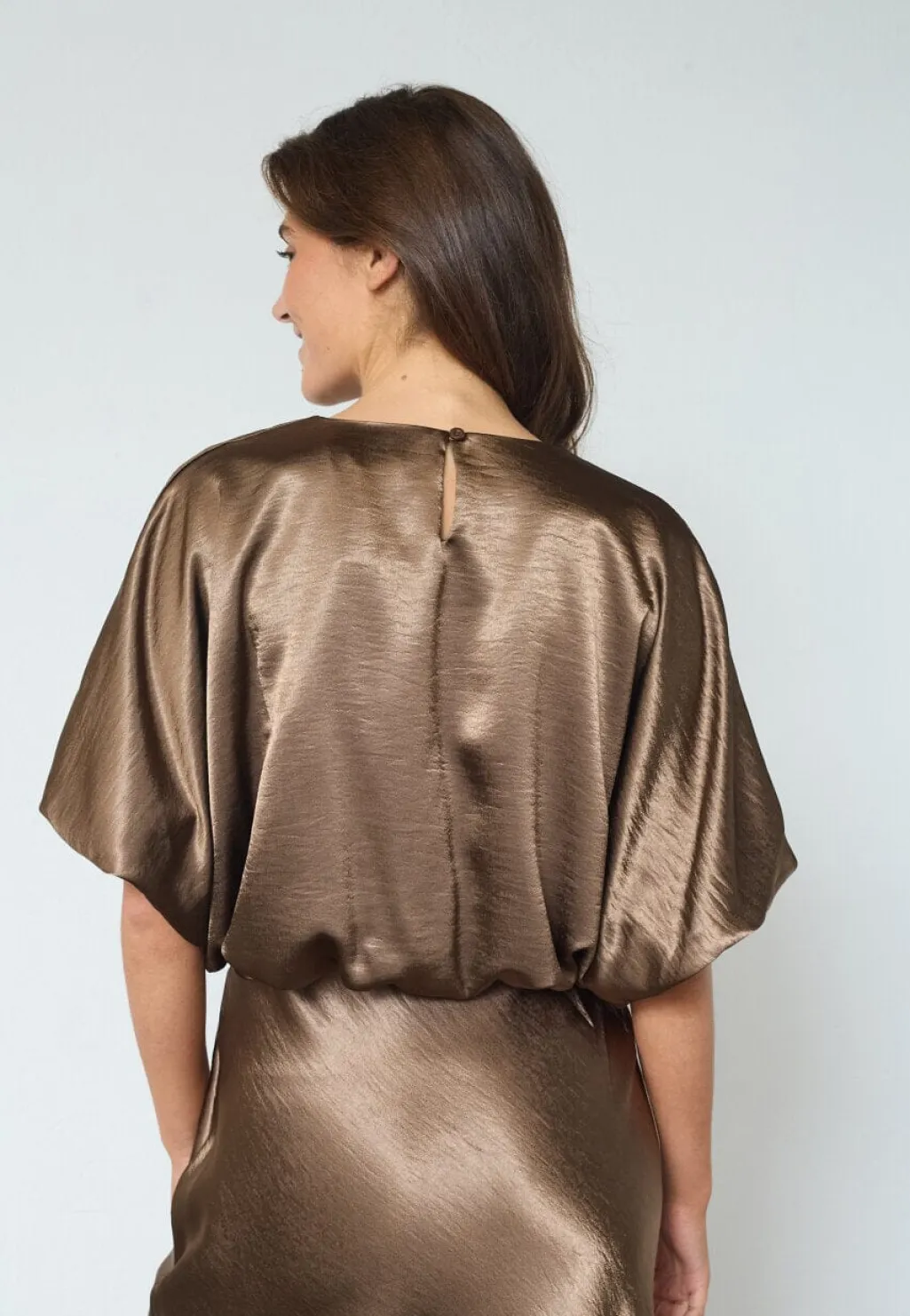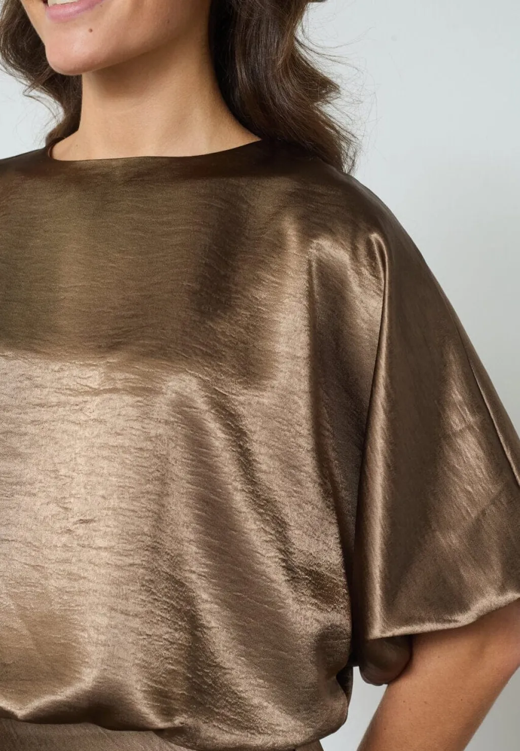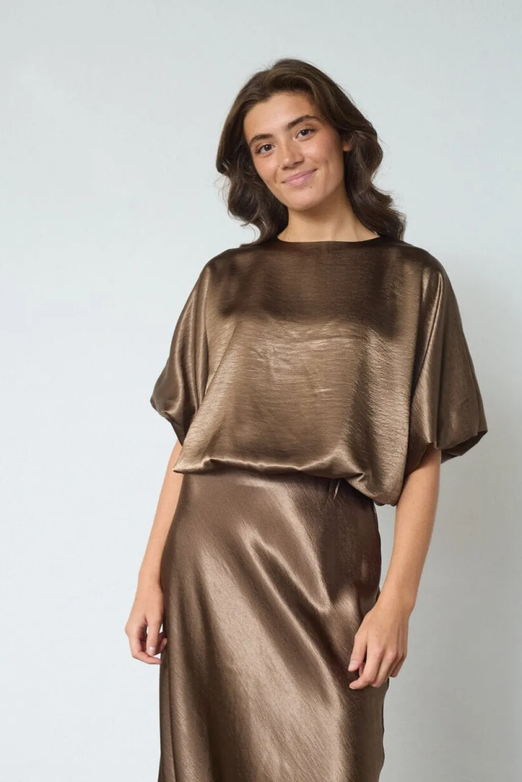 Brun top fra Sisters Point, lavet af 100 % polyester med en glat satinfinish. Toppen har korte ærmer og en løs pasform.
