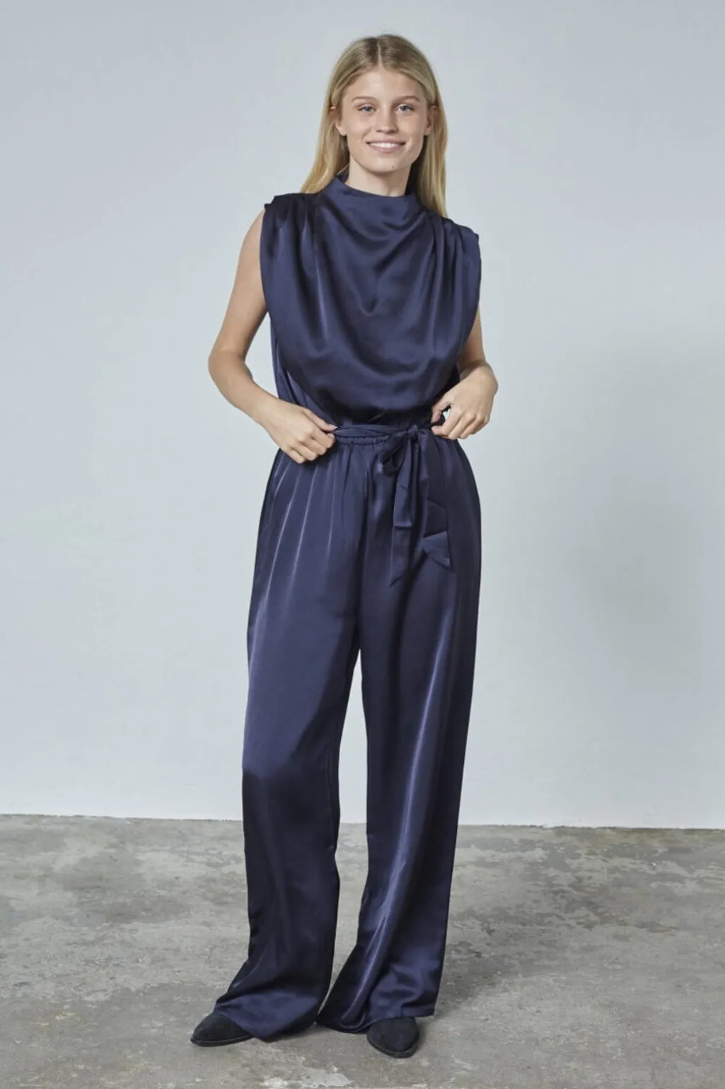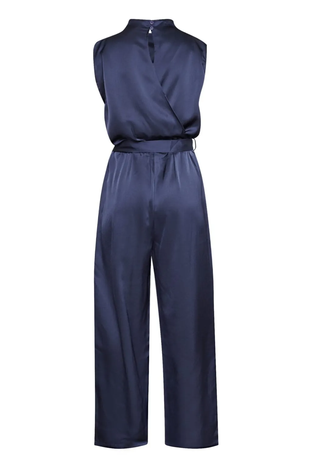 Mørkeblå jumpsuit fra Sisters Point i satin med høj hals. Den har en løs pasform og gulvlængde med et bindebånd i taljen, der kan justeres efter ønske.