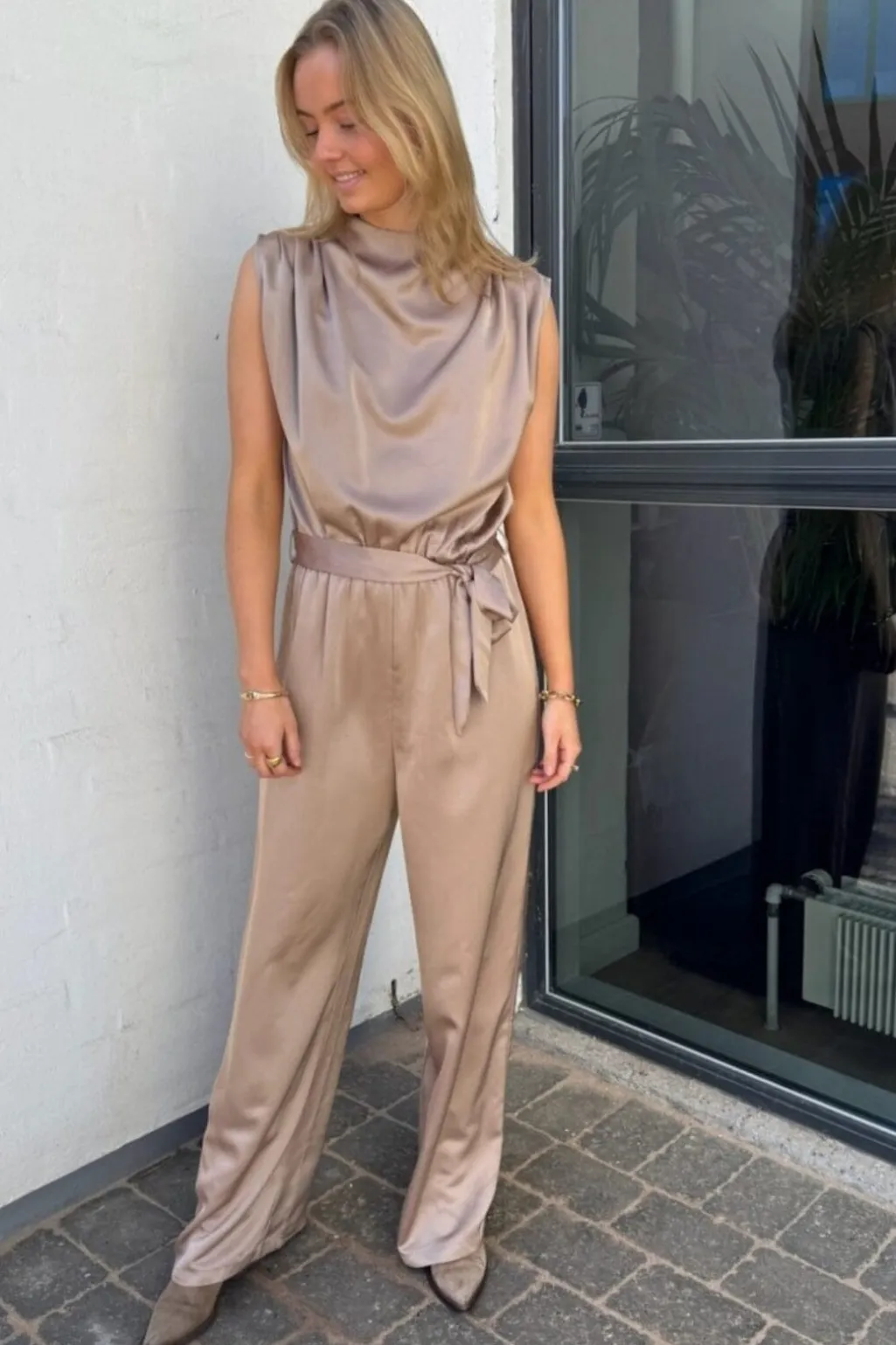 Champagnefarvet jumpsuit fra Sisters Point med høj hals og løs pasform. Den har udskæring i ryggen og et bindebånd i taljen, der kan justeres efter ønske.
