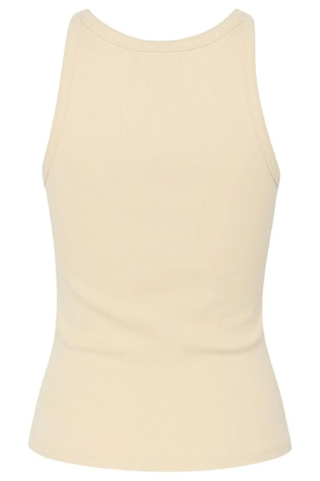 Smørgul tanktop fra Gestuz med ribbet tekstur og broderet logo. Den har en rund halsudskæring og er lavet i en blød bomuldsblanding med stretch, der gør den velegnet til både hverdag og træning.