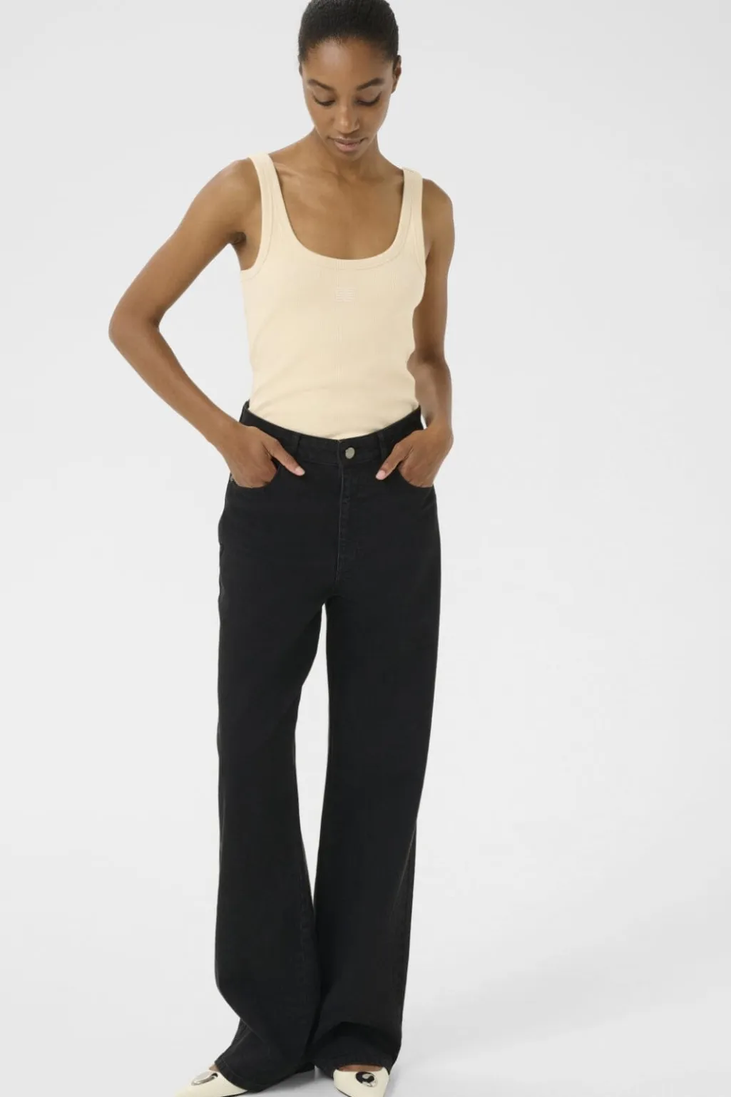 Ærmeløs top fra Gestuz i en lys gul nuance. Toppen har en rund halsudskæring og en ribbet tekstur med broderet logo på fronten.