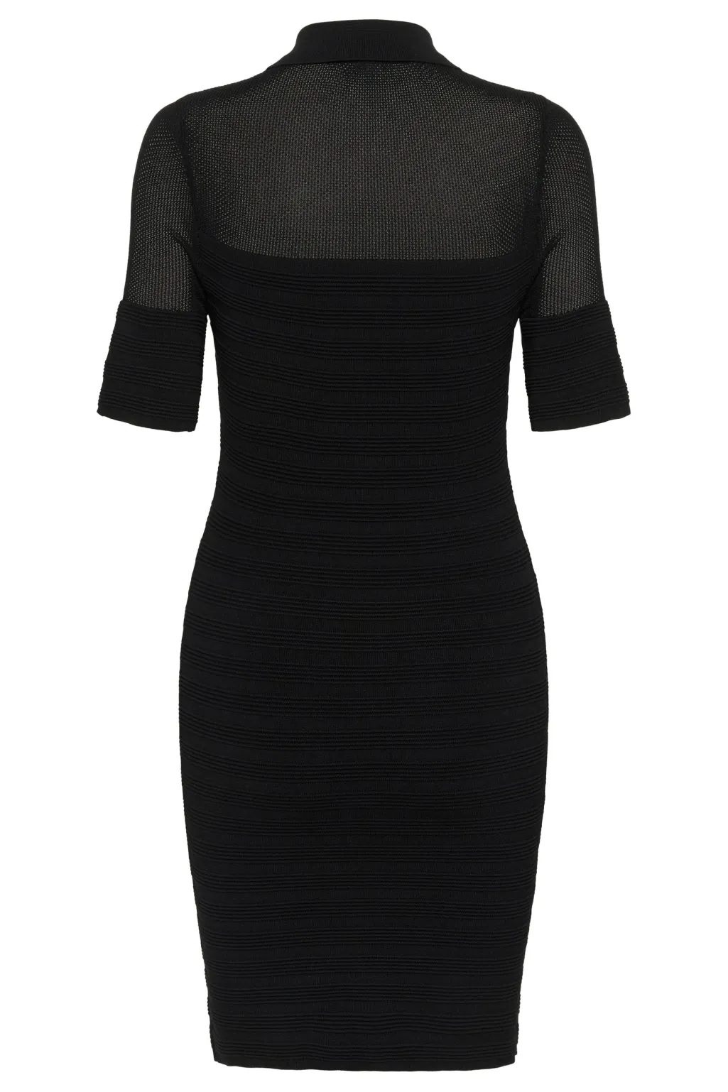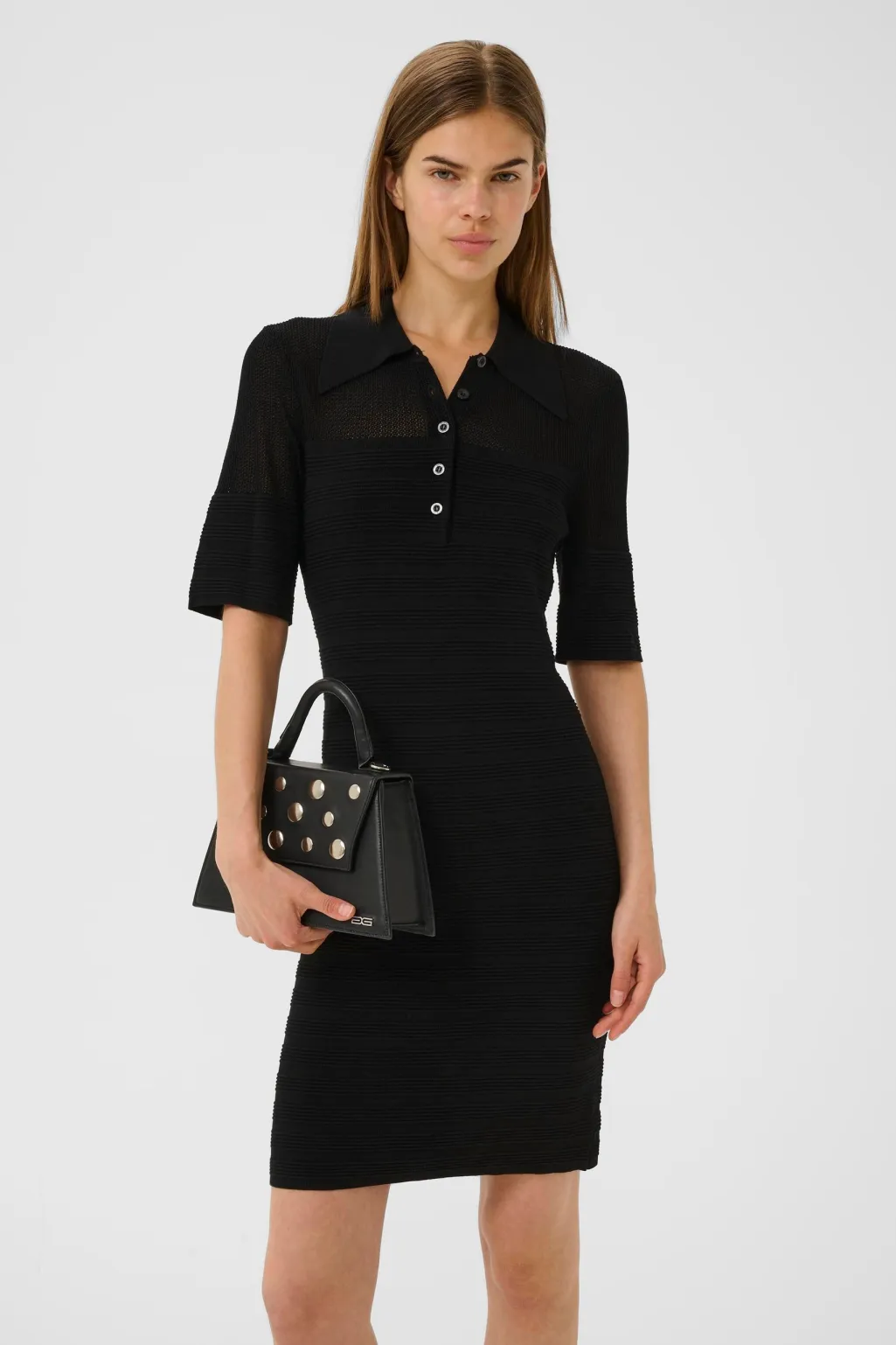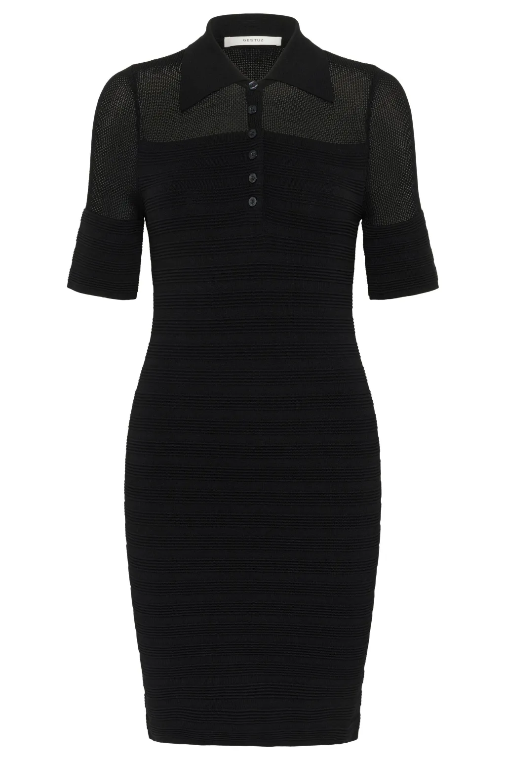 Sort kjole fra Gestuz med polokrave og blondedetaljer. Kjolen har en tætsiddende silhuet og går til låret. Kortærmet design med struktureret tekstur.
