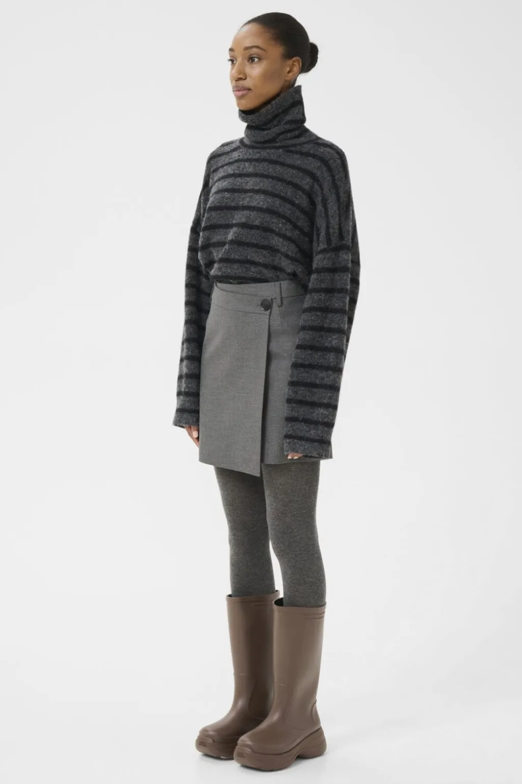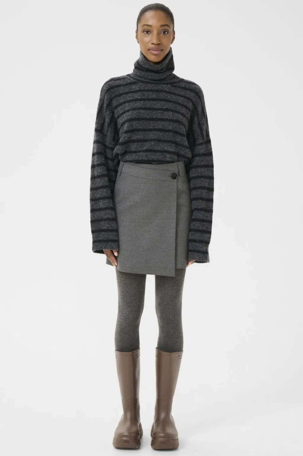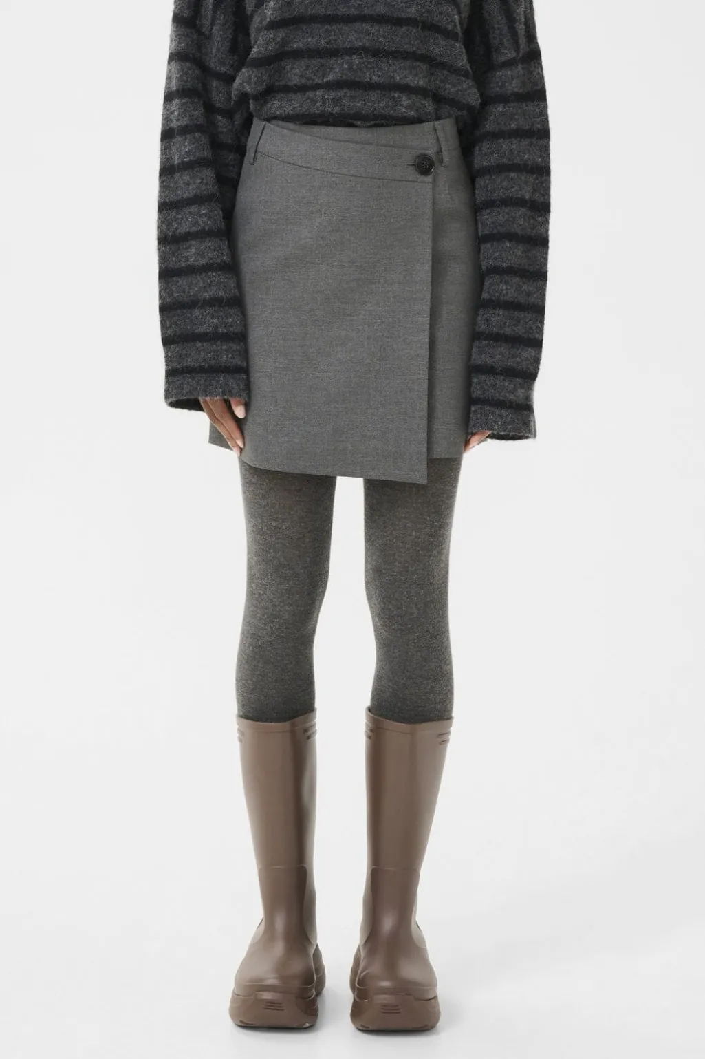 Mørkegråt omslagsskørt fra Gestuz med knapper i siden. Skørtet har en meleret overflade og en knælang silhuet.