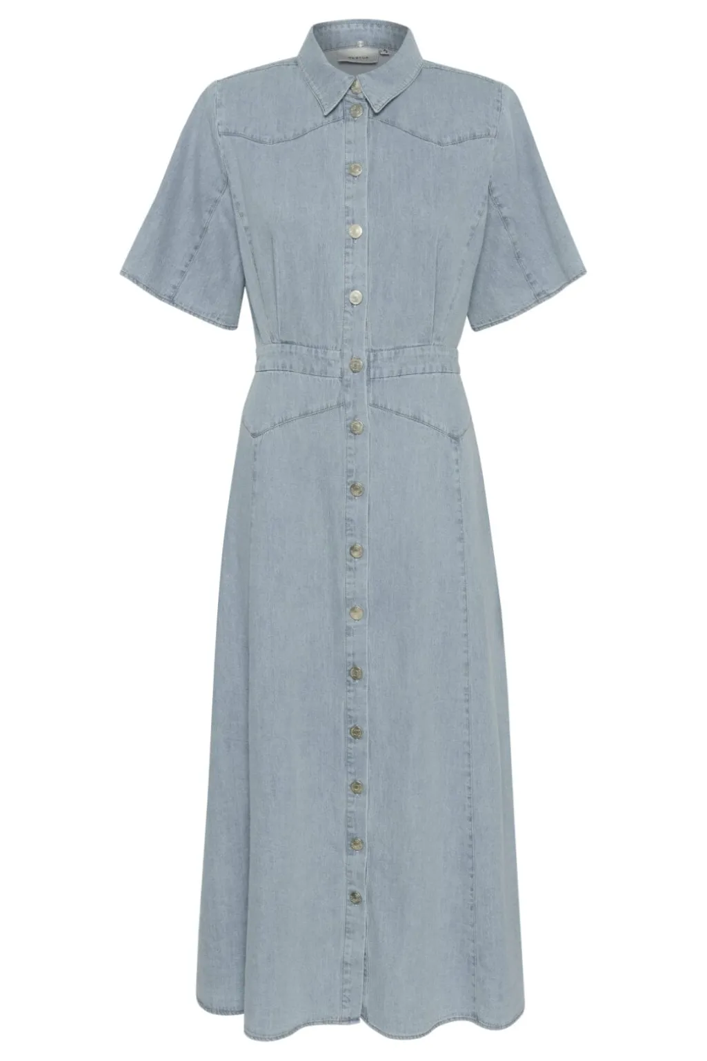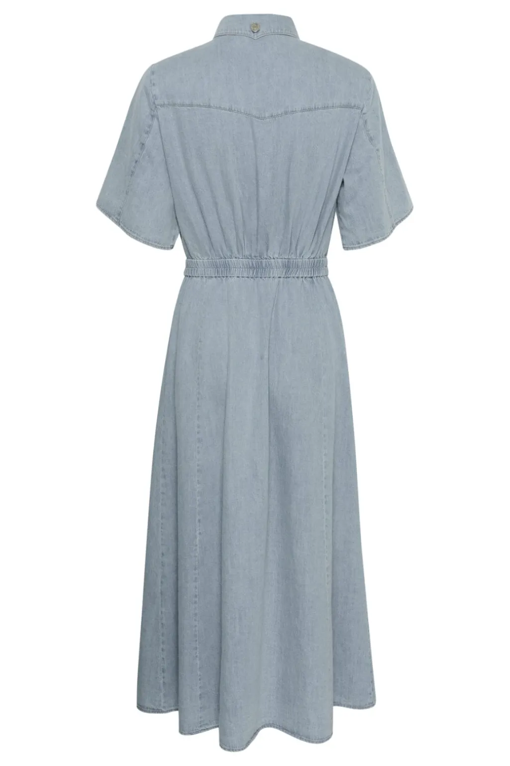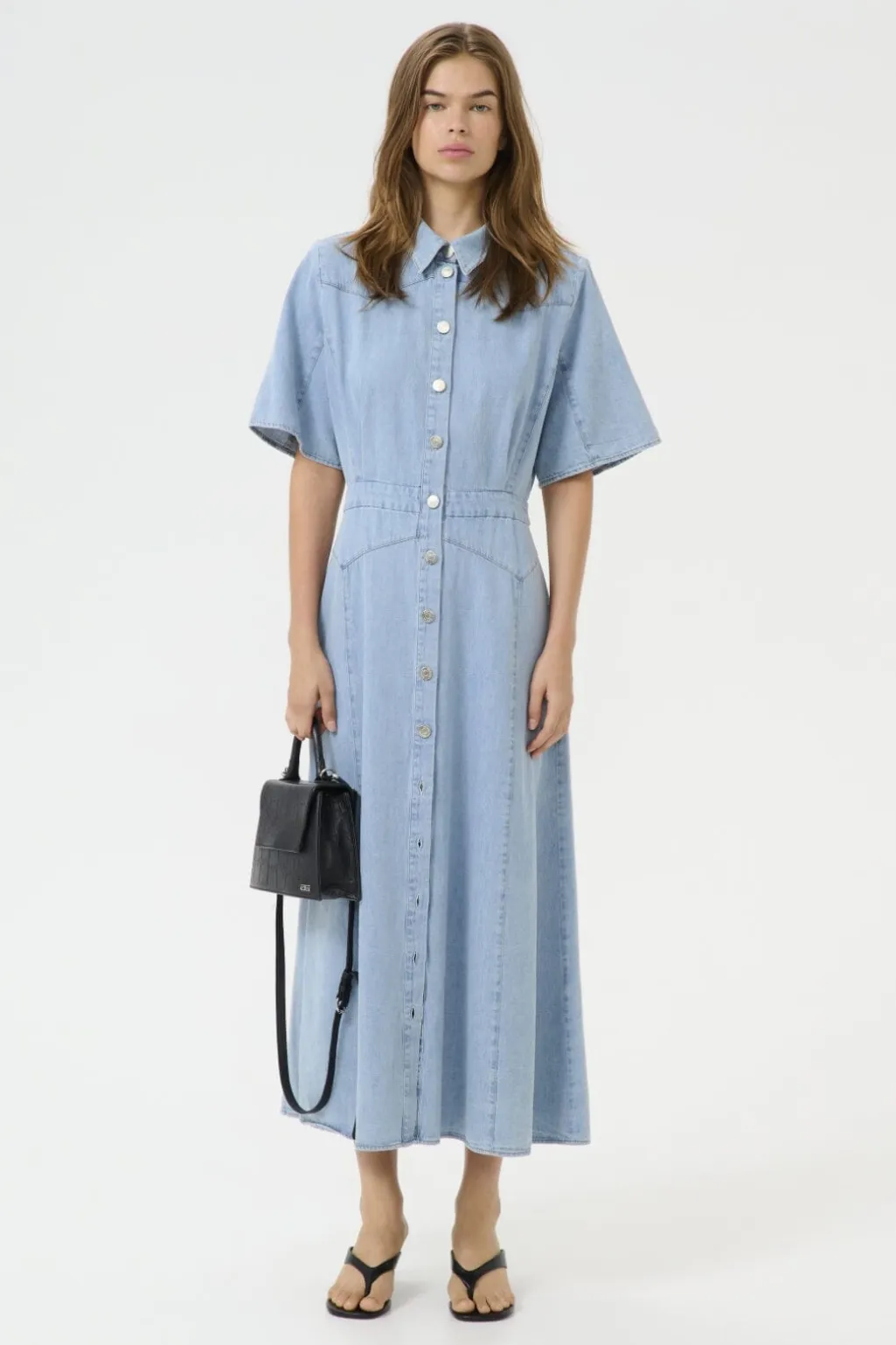 Lang kjole fra Gestuz i lys blå denimvask. Kjolen har skjortekrave, korte ærmer og knaplukning hele vejen ned. Den elastiske talje giver en god pasform.