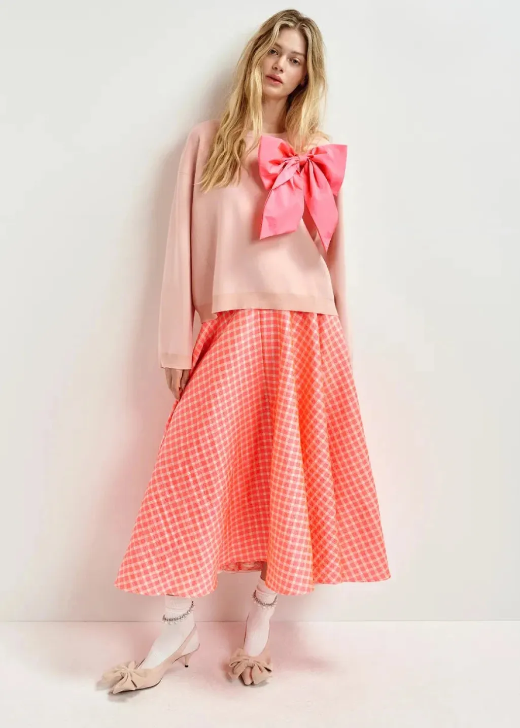 Nederdel fra Essentiel Antwerp i lyserød med ternet mønster. Den løse model har en længde til læggen og en almindelig taljehøjde. Sløjfedetaljer giver nederdelen et fint præg.