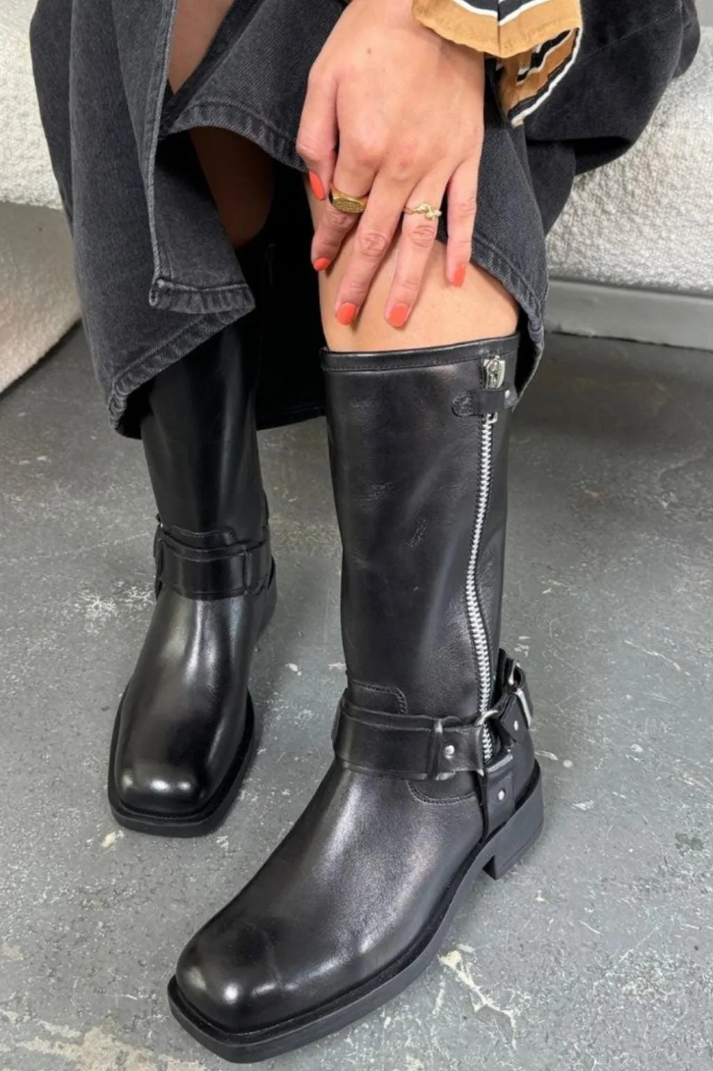 Sorte læderstøvler fra Copenhagen Shoes med firkantet snude. Støvlen har både en funktionel og en dekorativ lynlås samt en rem omkring anklen med sølvdetaljer.