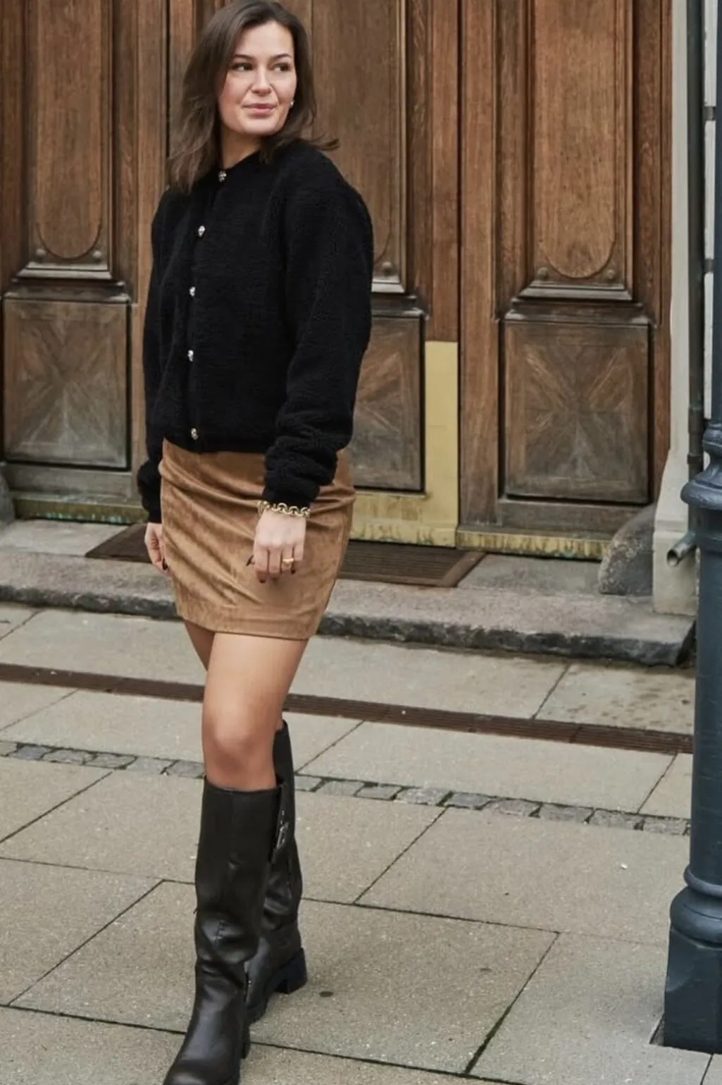 Kort nederdel fra Neo Noir i imiteret ruskind med cognacfarvet overflade. A-line designet og den glatte tekstur giver nederdelen et rent og enkelt udtryk.