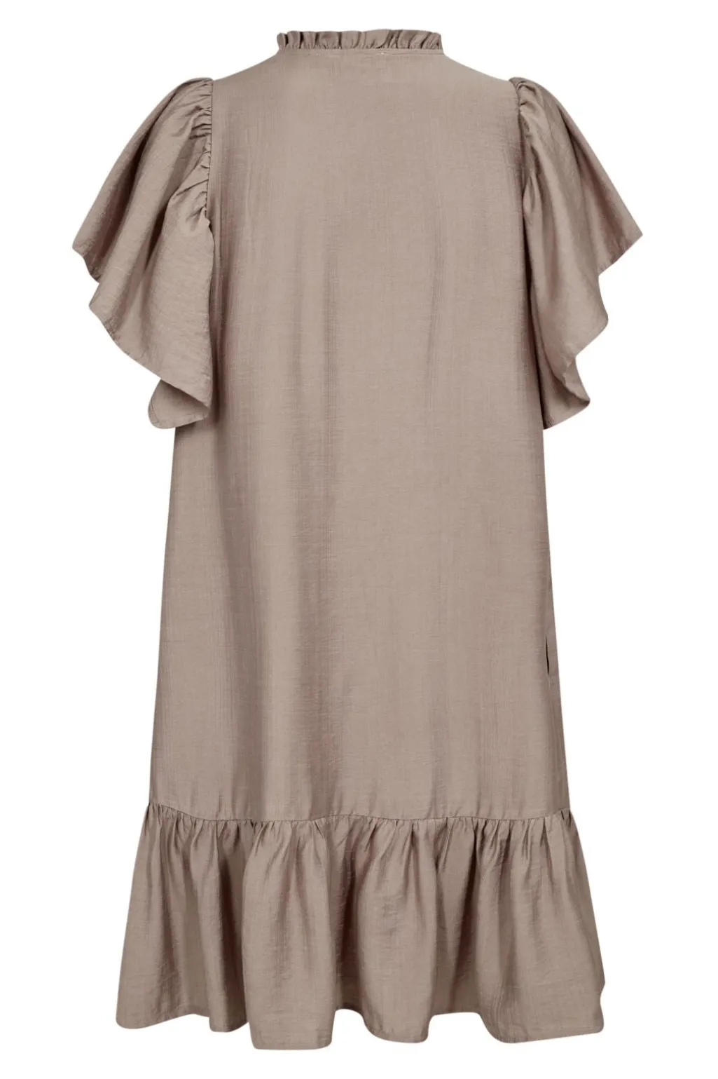 Kort kjole fra Co´Couture i valnøddefarvet stof. Kjolen har V-halsudskæring og korte ærmer med flæser. Flæsekanten forneden giver kjolen et blødt fald.
